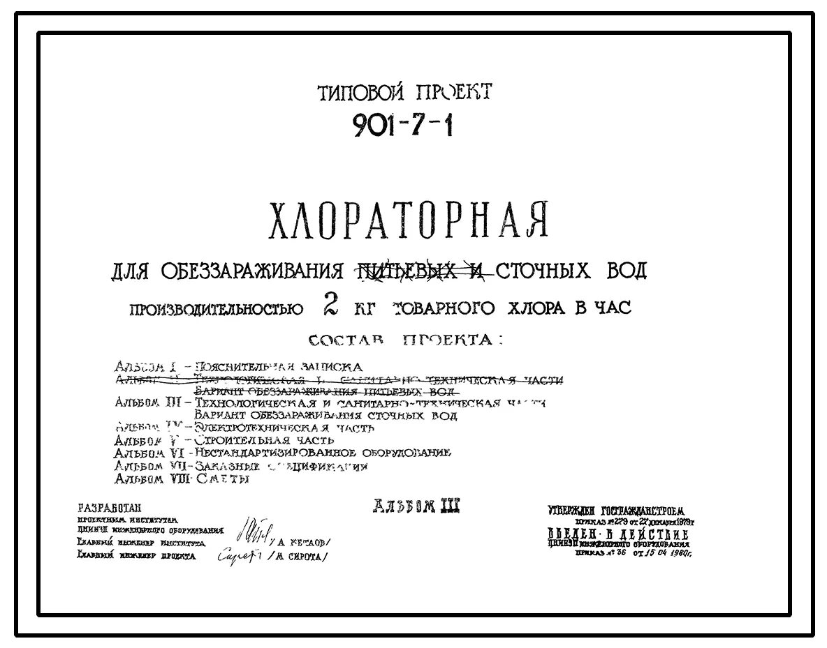 Типовой проект 901-7-1 Хлораторная для обеззараживания питьевых и сточных вод производительностью 2 кг товарного хлора в час