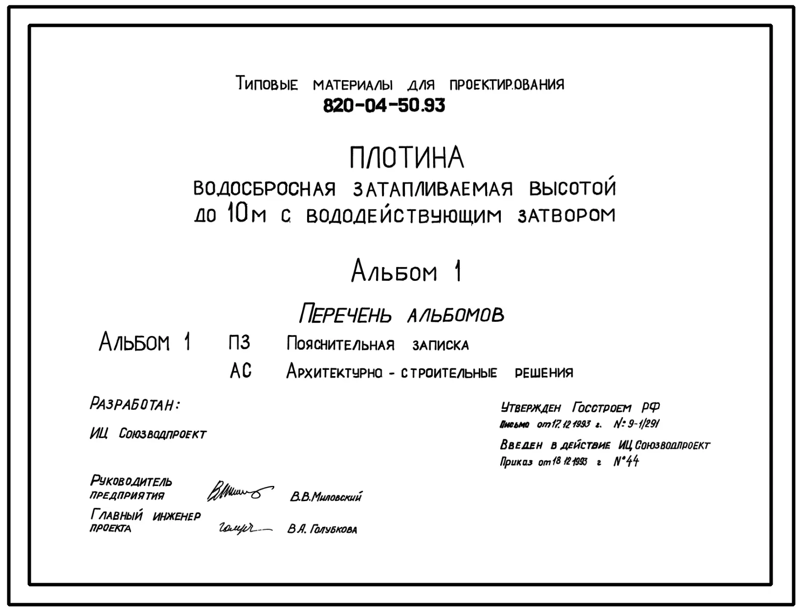 Типовой проект 820-04-50.93 Плотина водосбросная затапливаемая высотой до 10 м с вододействующим затвором