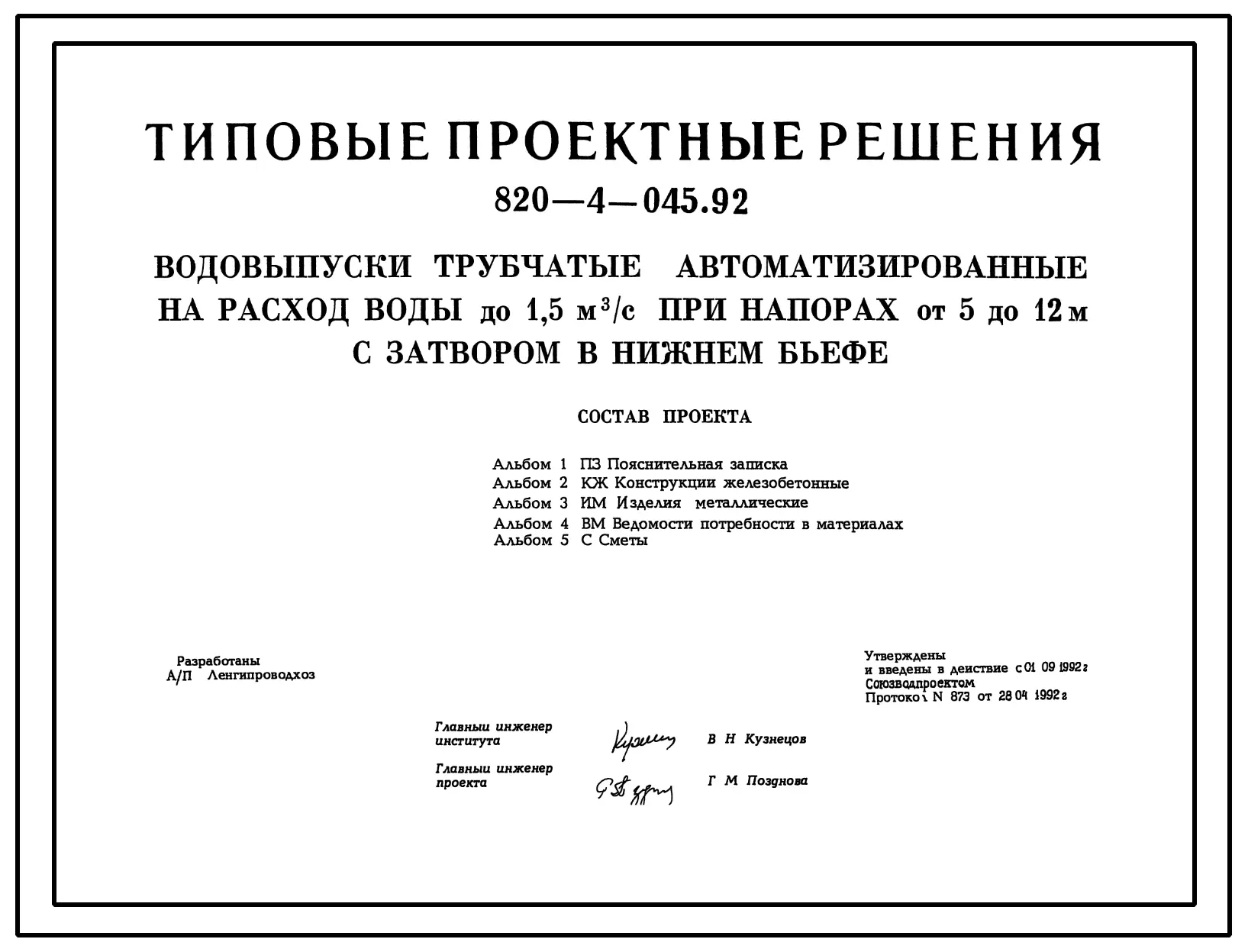 Типовой проект 820-4-045.92 Водовыпуски трубчатые автоматизированные на расход воды до 1,5 м3/с при напорах от 5 до 12 м с затвором в нижнем бьефе