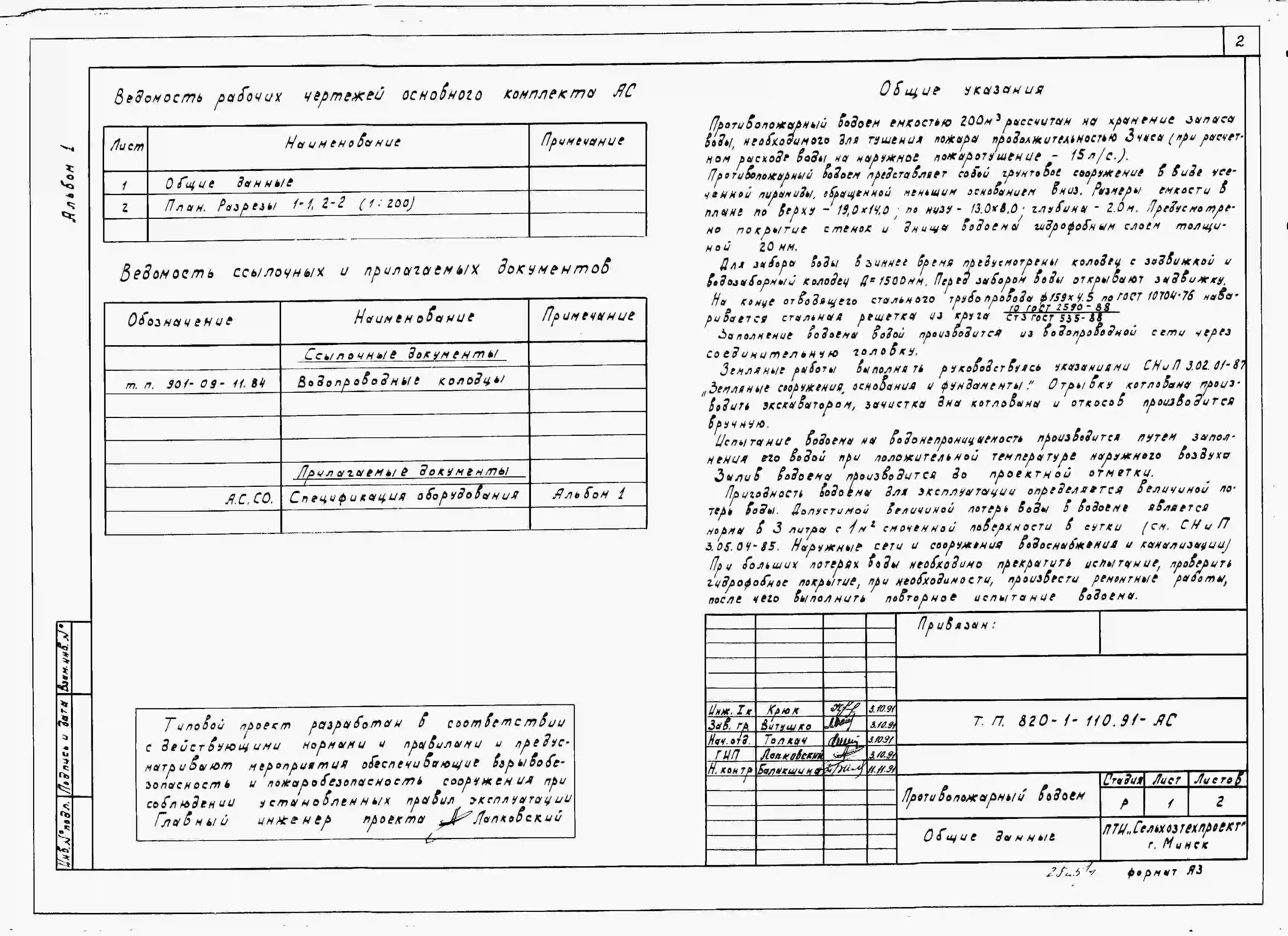 Типовой проект 820-1-110.91 Противопожарный водоем емкостью 200 м3