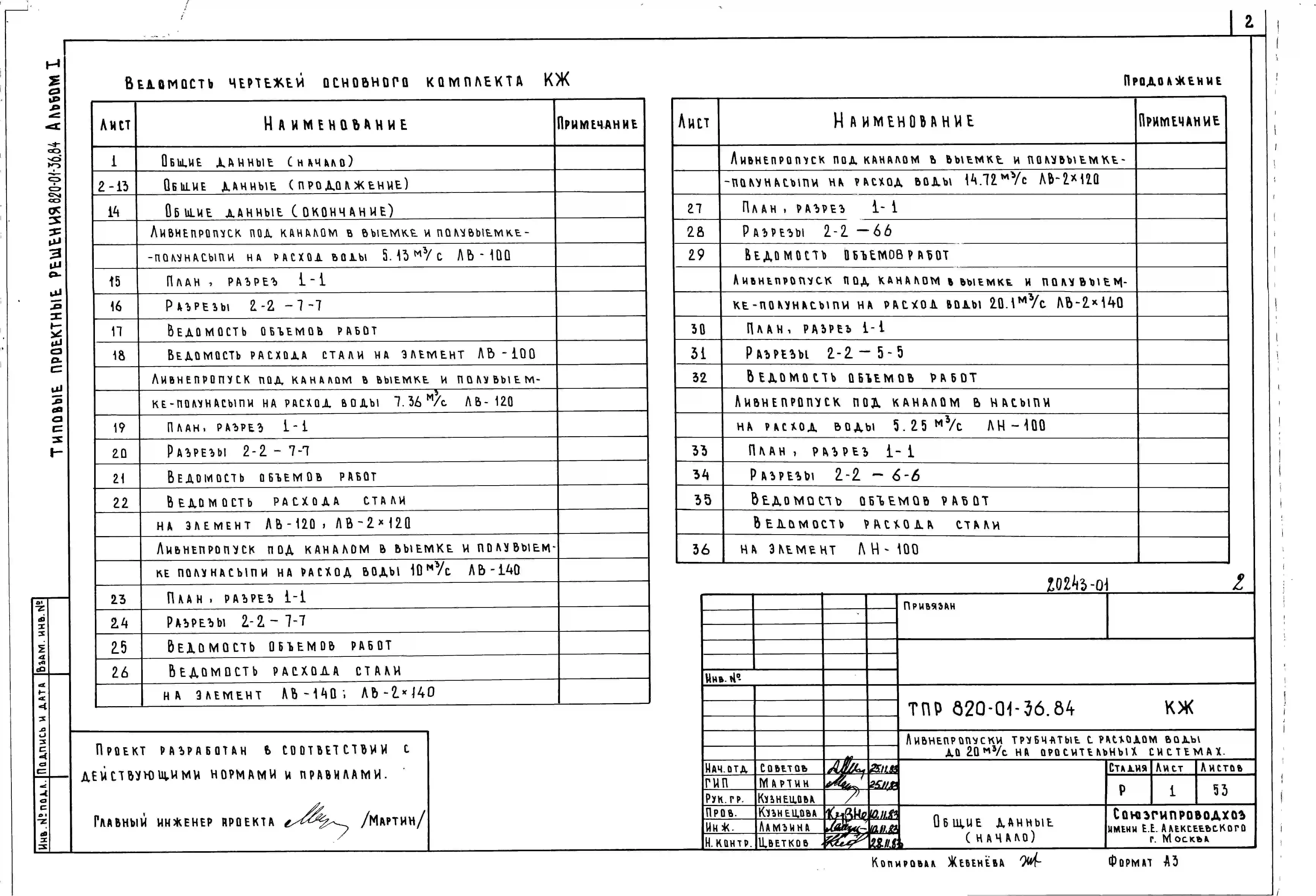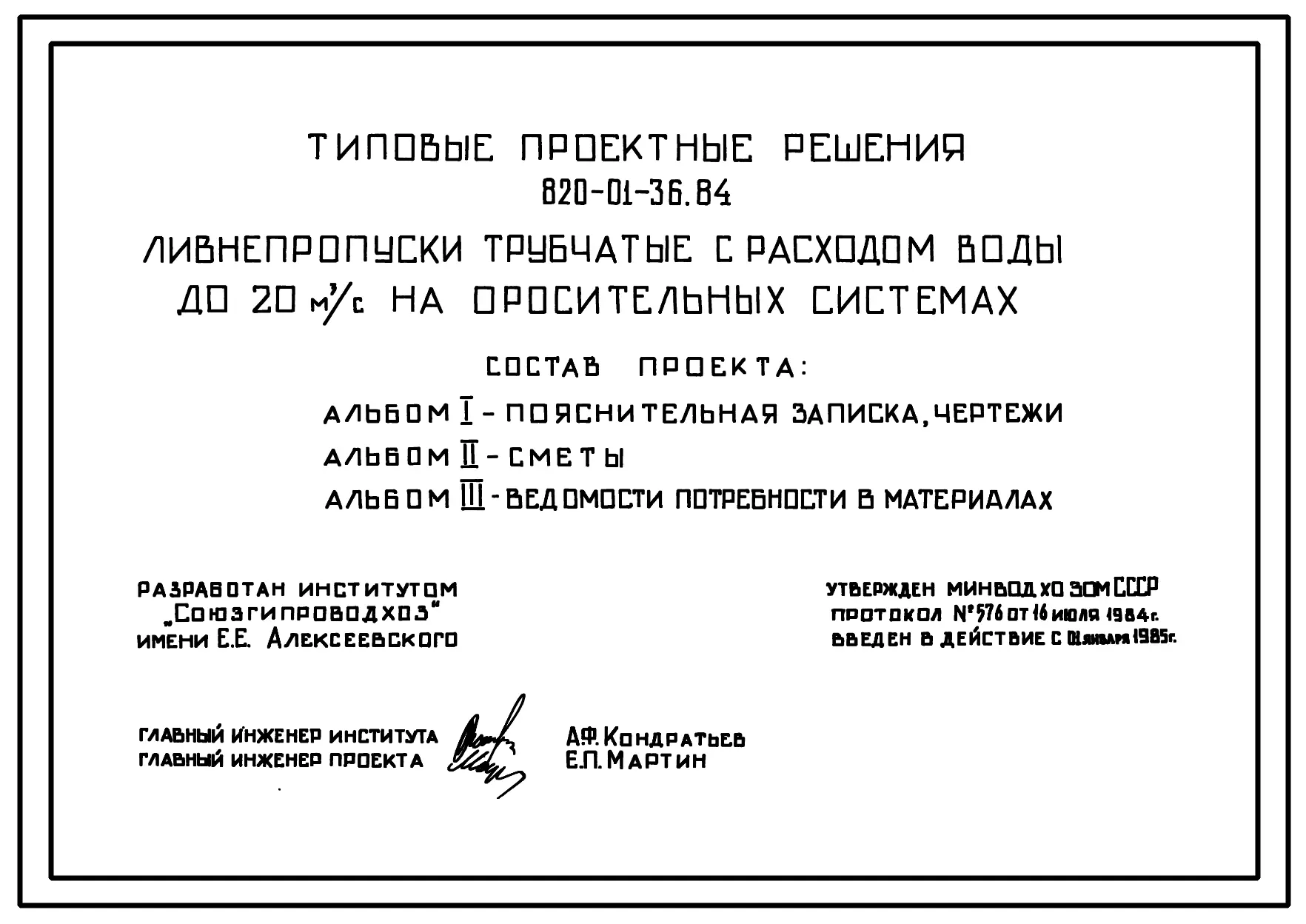 Типовой проект 820-01-36.84 Ливнепропуски трубчатые с расходом воды до 20 м.куб/с на оросительных системах