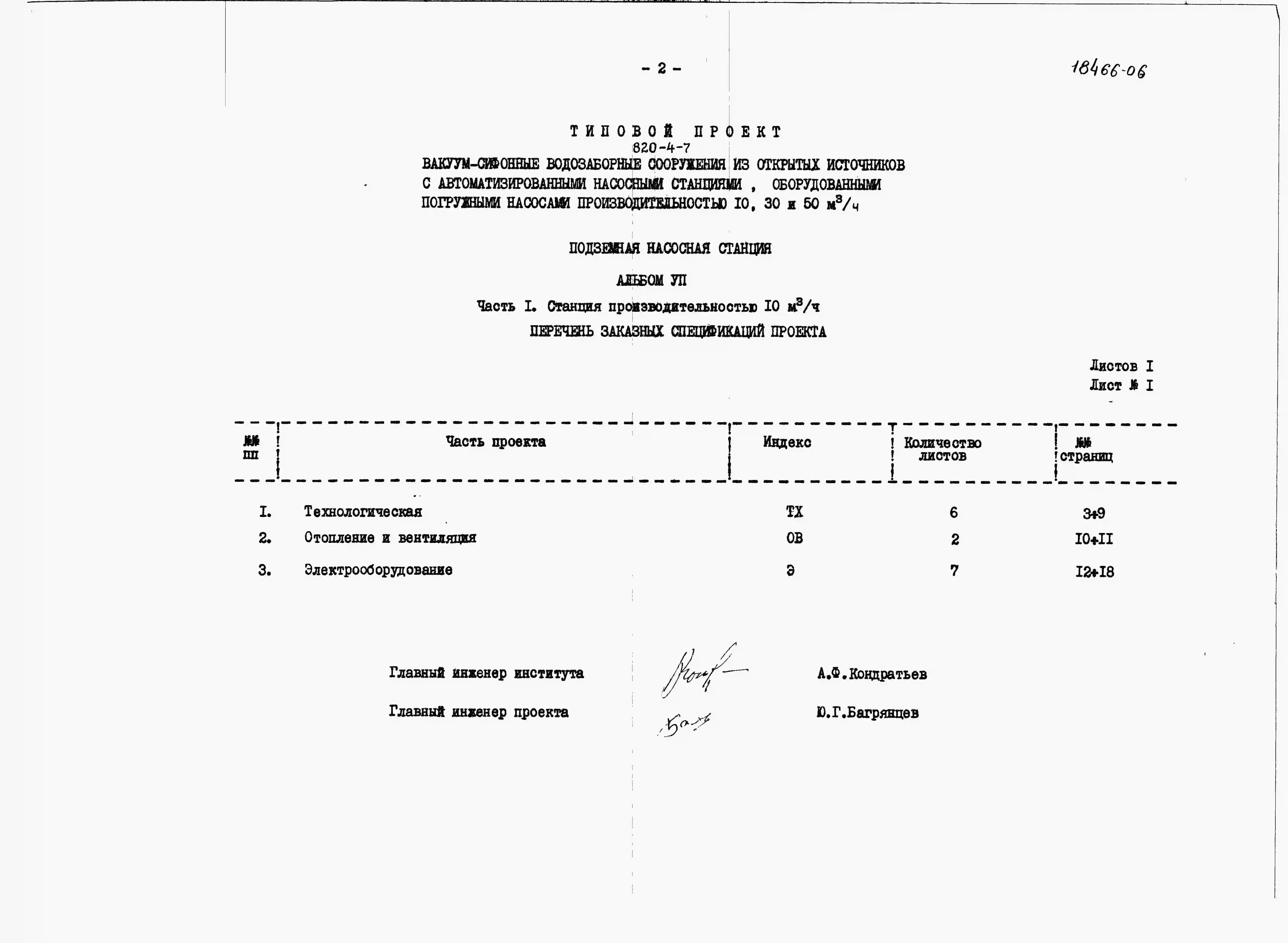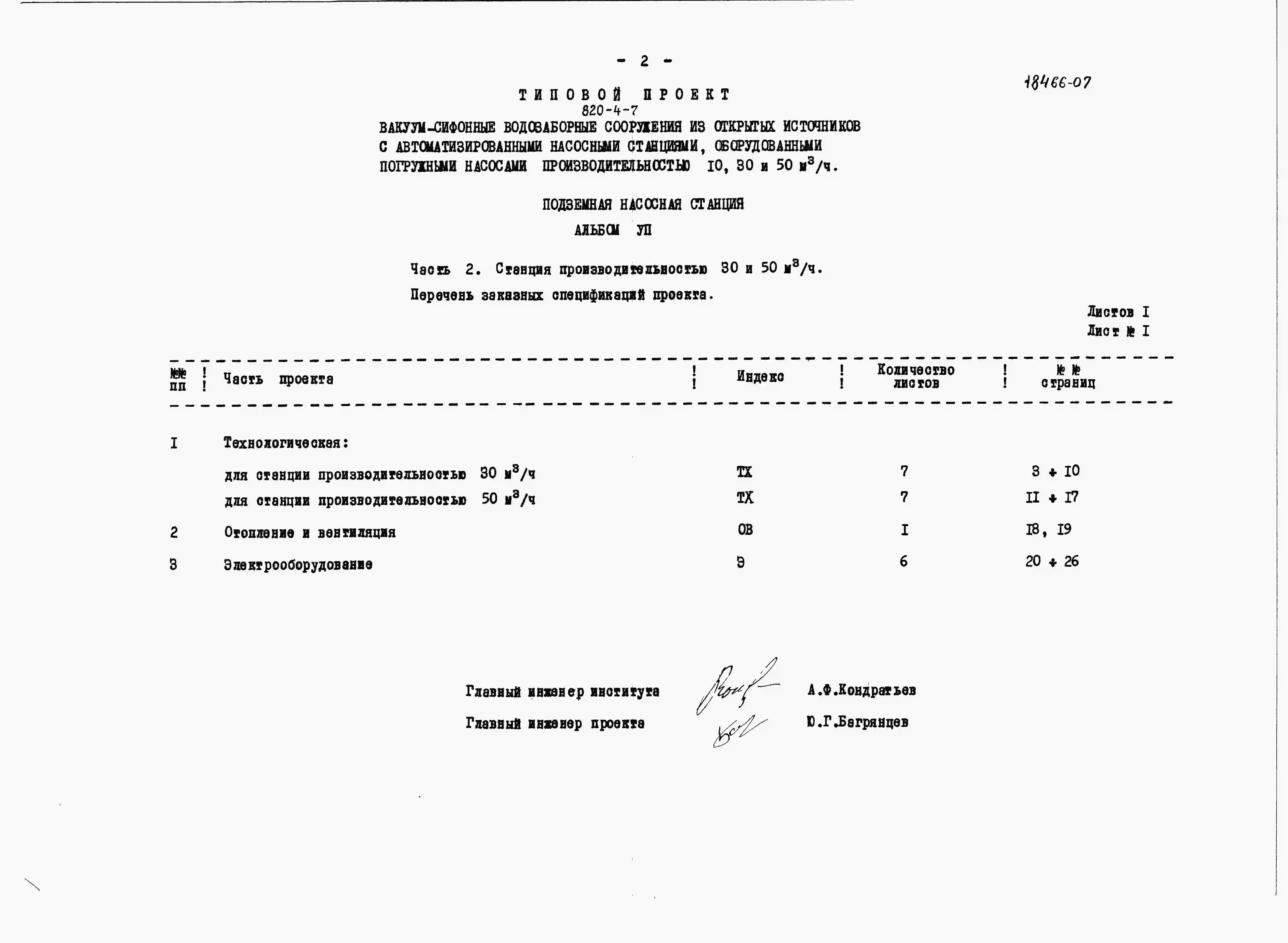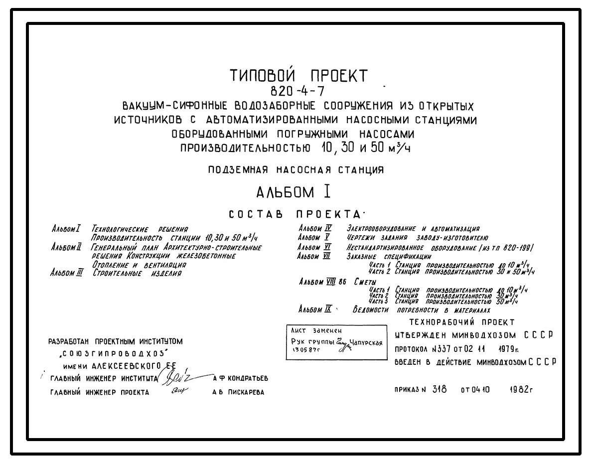 Типовой проект 820-4-7 Вакуум-сифонные водозаборные сооружения из открытых источников с автоматизированными насосными станциями, оборудованными погружными насосами производительностью 10, 30 и 50 м.куб/ч. Подземная насосная станция