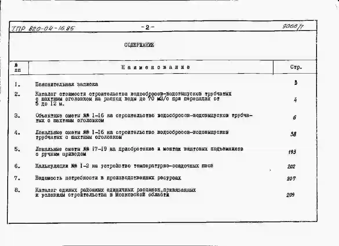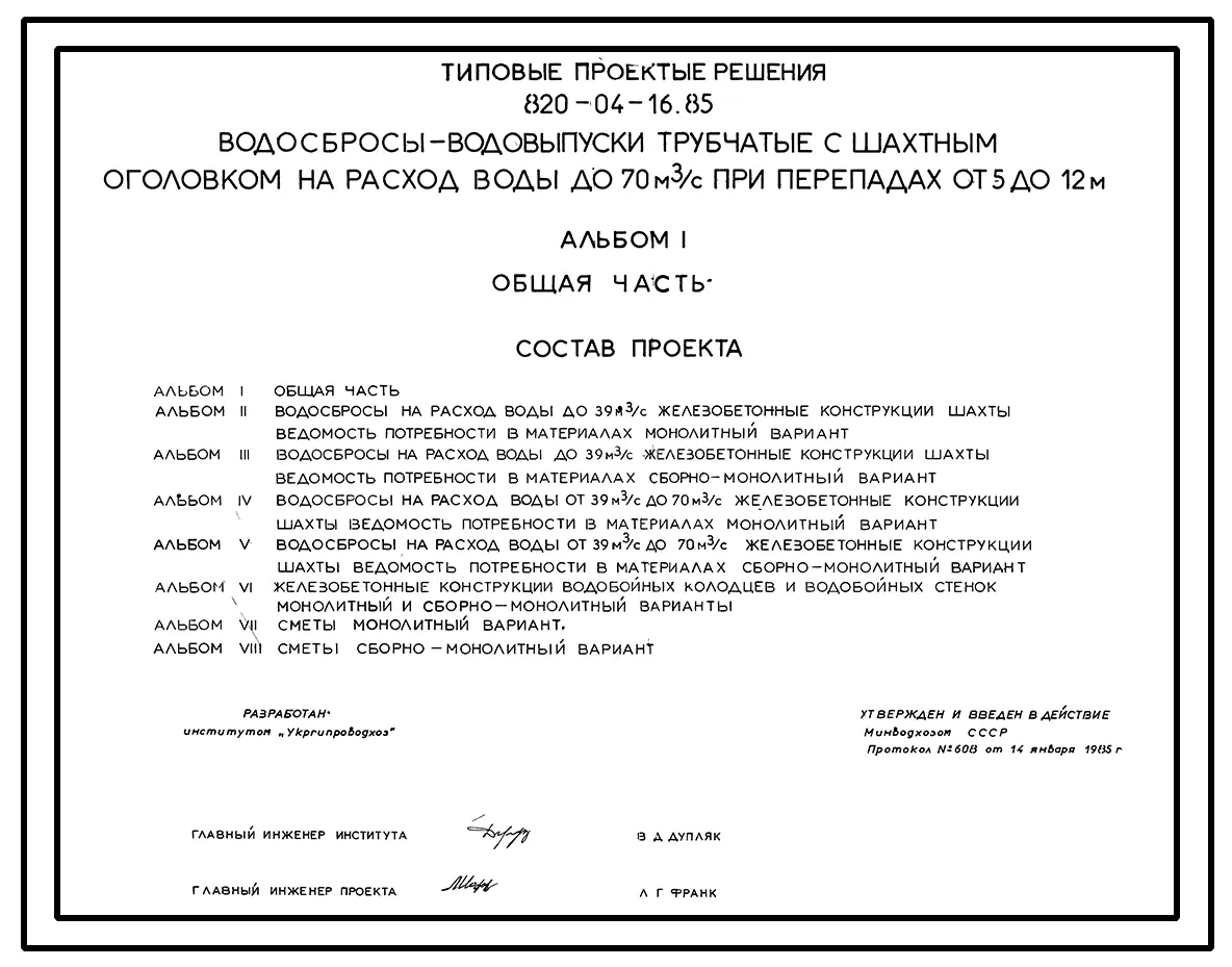 Типовой проект 820-04-16.85 Водосбросы-водовыпуски трубчатые с шахтным оголовком на расход воды до 70 м.куб./с при перепадах от 5 до 12 м