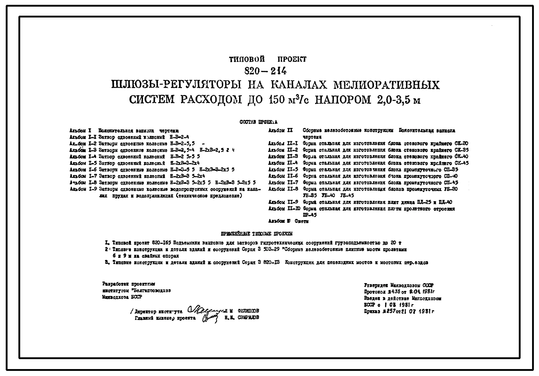 Типовой проект 820-214 Шлюзы-регуляторы на каналах мелиоративных систем расходом до 150 м.куб/с напором 2,0-3,5 м.