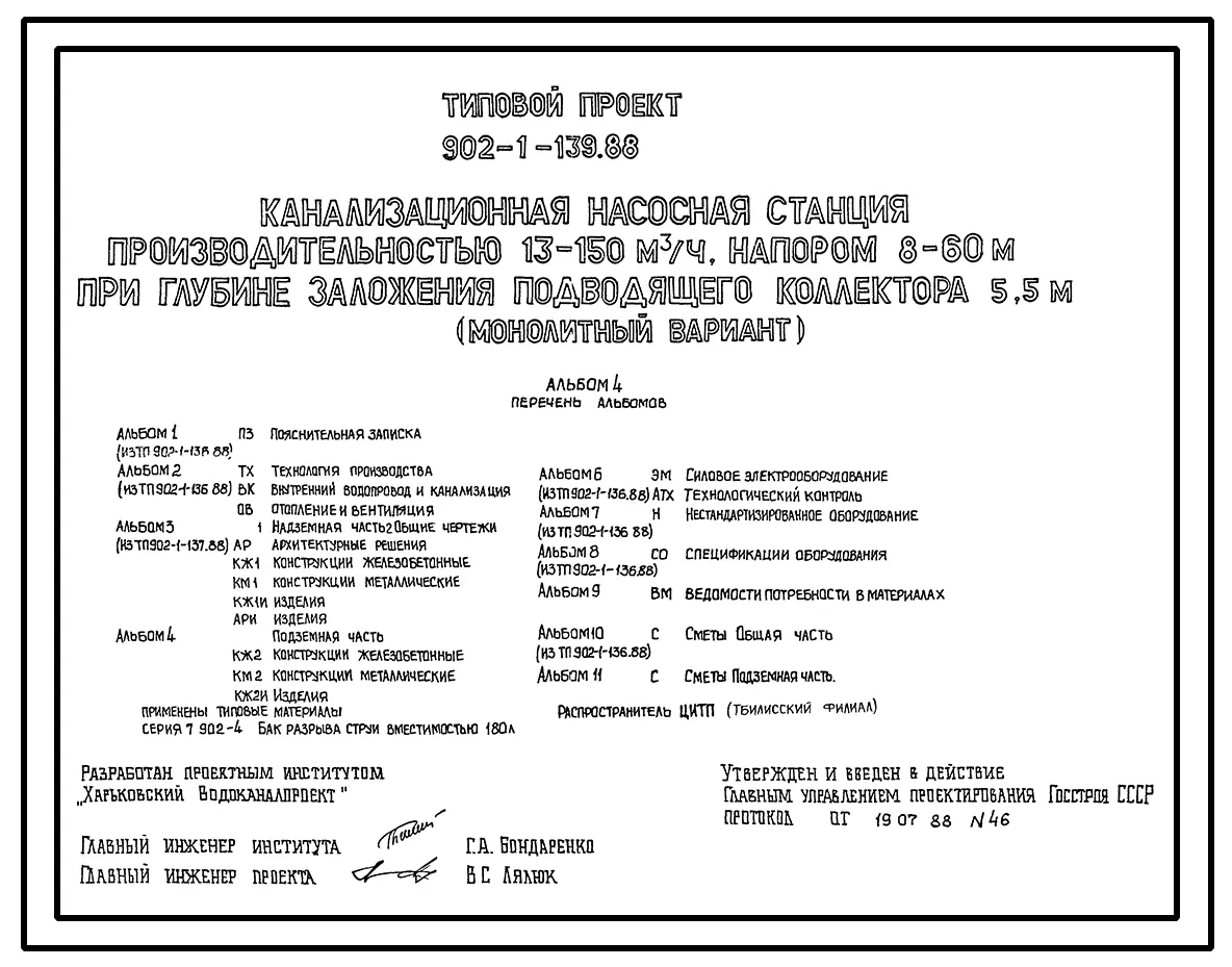 Типовой проект 902-1-139.88 Канализационная насосная станция производительностью 13–150 м3/ч, напором 8–60 м при глубине заложения подводящего коллектора 5,5 м (монолитный вариант)