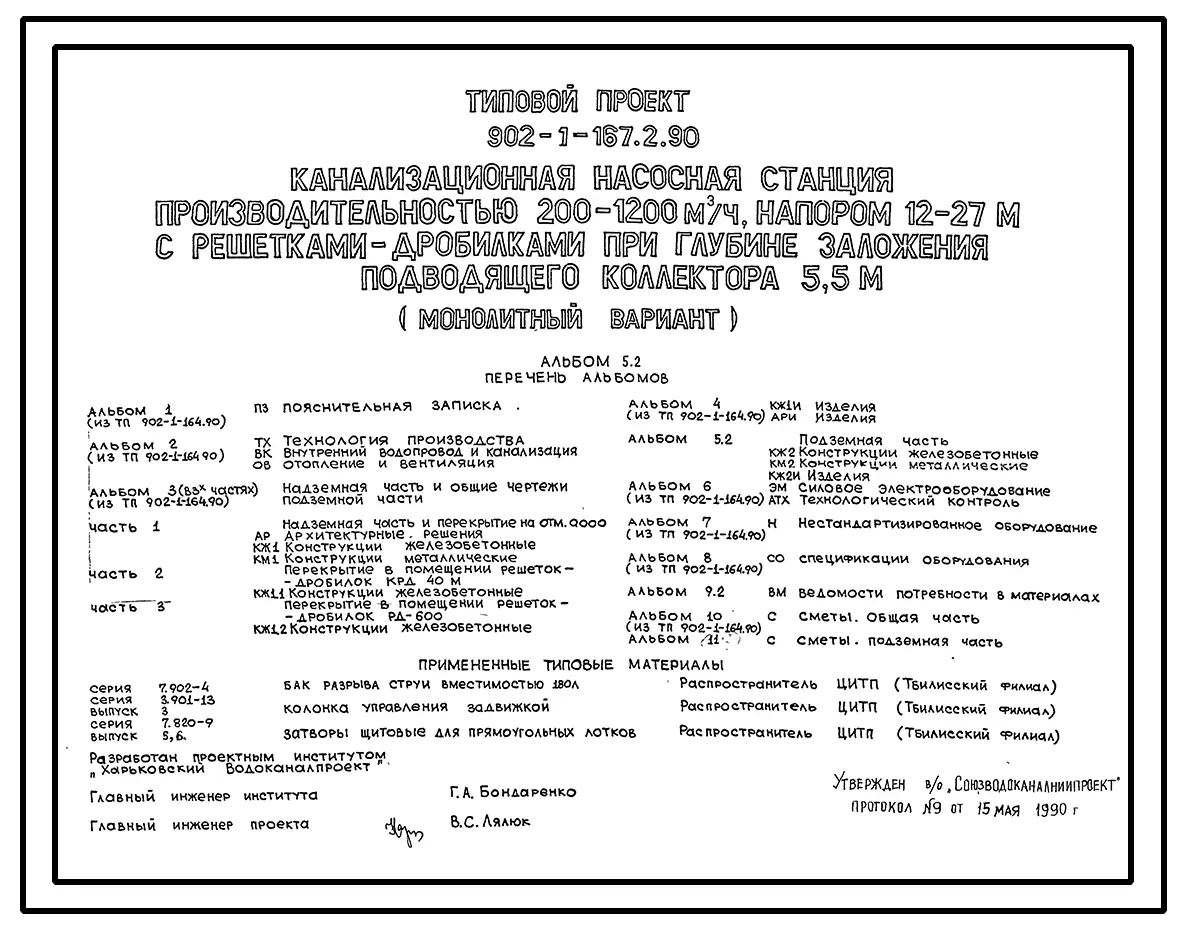 Типовой проект 902-1-167.2.90 Канализационная насосная станция производительностью 200–1200 м3/ч, напором 12–27 м с решетками-дробилками при глубине заложения подводящего коллектора 5,5 м. Конструктивный вариант – опускной способ