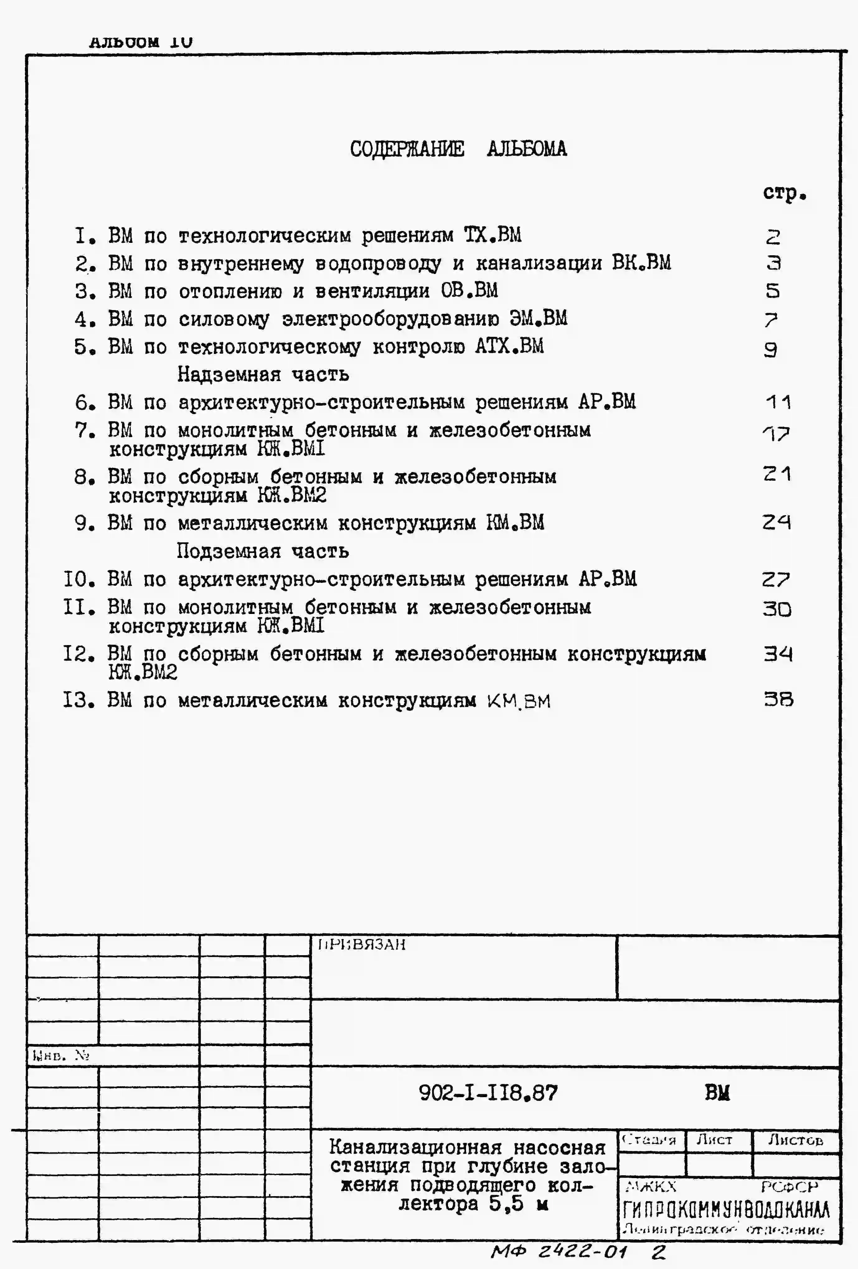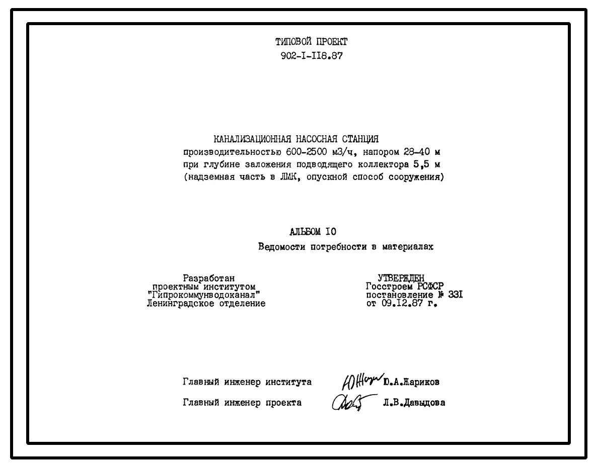 Типовой проект 902-1-118.87 Канализационная насосная станция производительностью 600–2500 м3/ч, напором 28–40 м при глубине заложения подводящего коллектора 5,5 м (в сборных железобетонных конструкциях, опускной способ сооружения)
