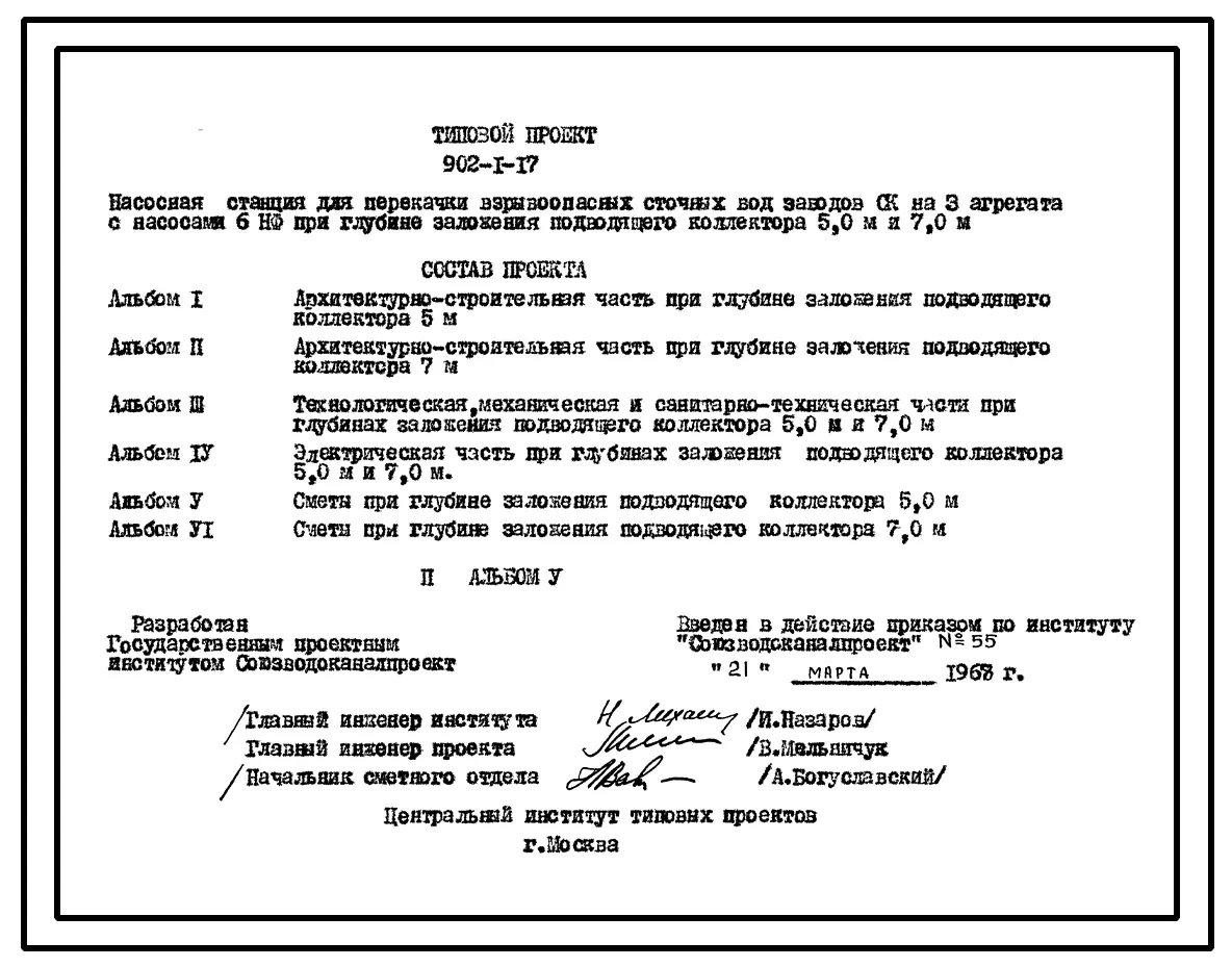 Типовой проект 902-1-17 Насосная станция для перекачки взрывоопасных сточных вод заводов СК на 3 агрегата с насосами 6 НФ при глубине заложения подводящего коллектора 5,0 и 7,0 м