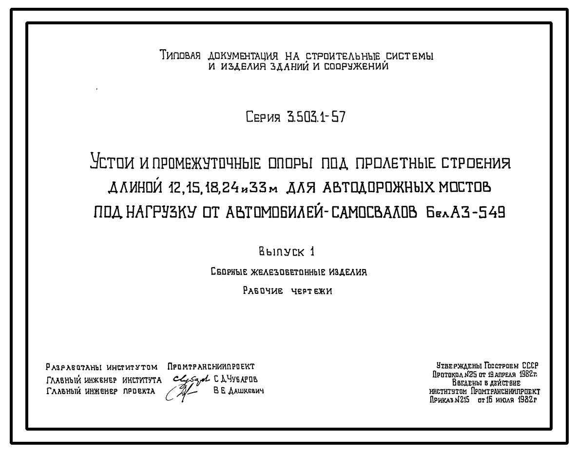 Серия 3.503.1-57 Устои и промежуточные опоры под пролетные строения длиной 12, 15, 18, 24 и 33 м для автодорожных мостов под нагрузку от автомобилей-самосвалов БелАЗ-549. Материалы для проектирования. Рабочие чертежи.