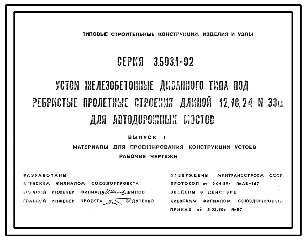 Серия 3.503.1-92 Устои железобетонные диванного типа под ребристые пролетные строения длиной 12, 18, 24 и 33 м для автодорожных мостов. Материалы для проектирования. Рабочие чертежи.
