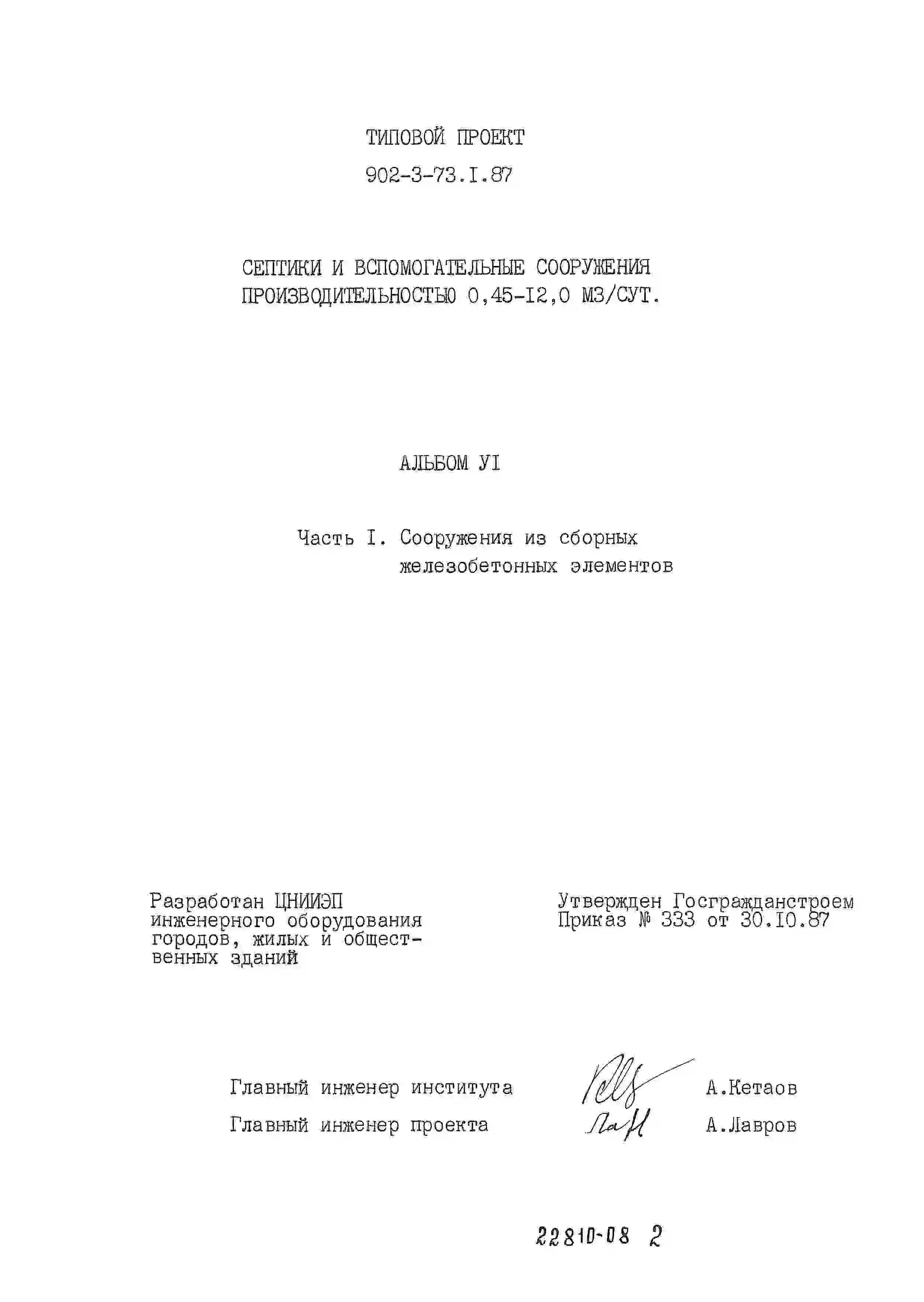 Типовой проект 902-3-73.1.87 Септики и вспомогательные сооружения производительностью 0,45 – 12,0 куб.м в сутки