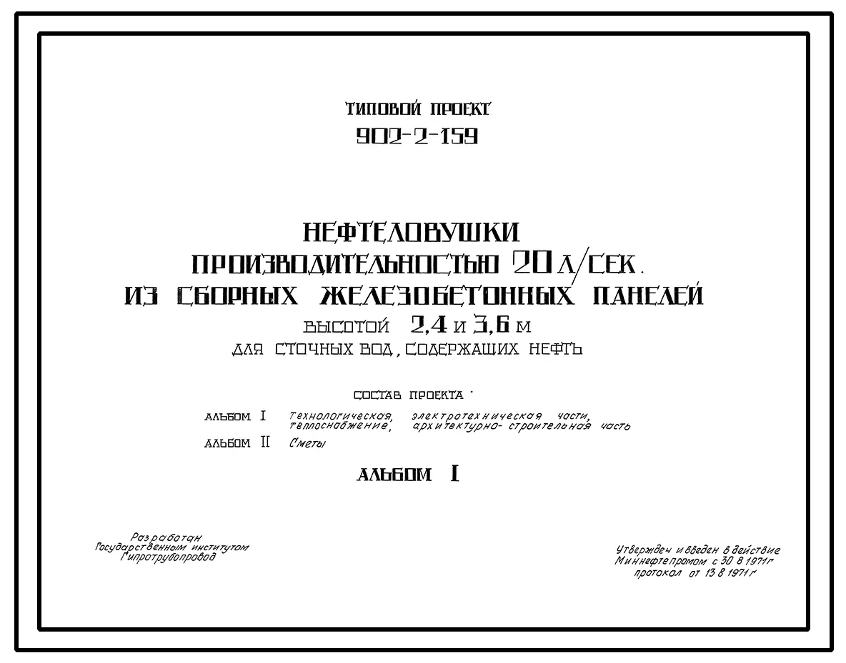 Типовой проект 902-2-159 Нефтеловушки производительностью 20 л/с из сборных железобетонных панелей высотой 2,4 и 3,6 м для сточных вод, содержащих нефть