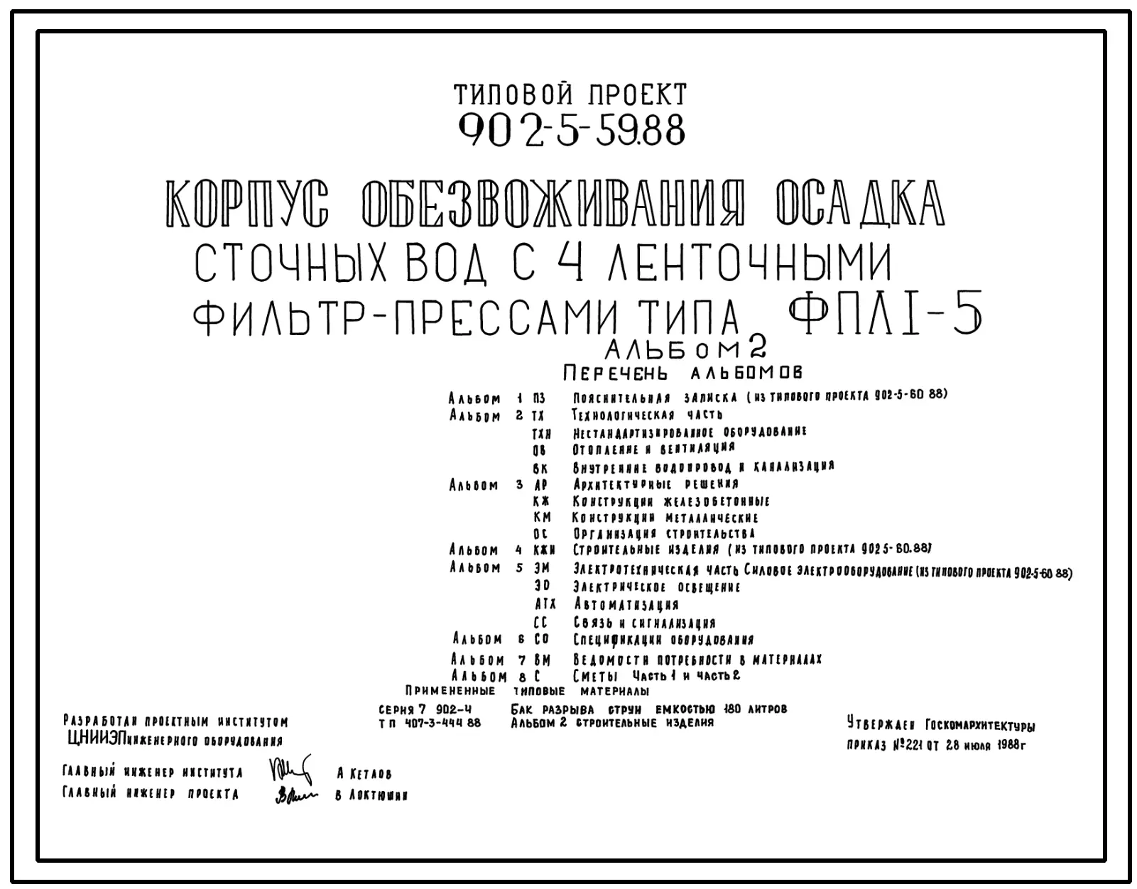 Типовой проект 902-5-59.88 Корпус обезвоживания осадка сточных вод с 4 ленточными фильтр-прессами ФПЛ1-5. Рабочие чертежи. Полный проект.