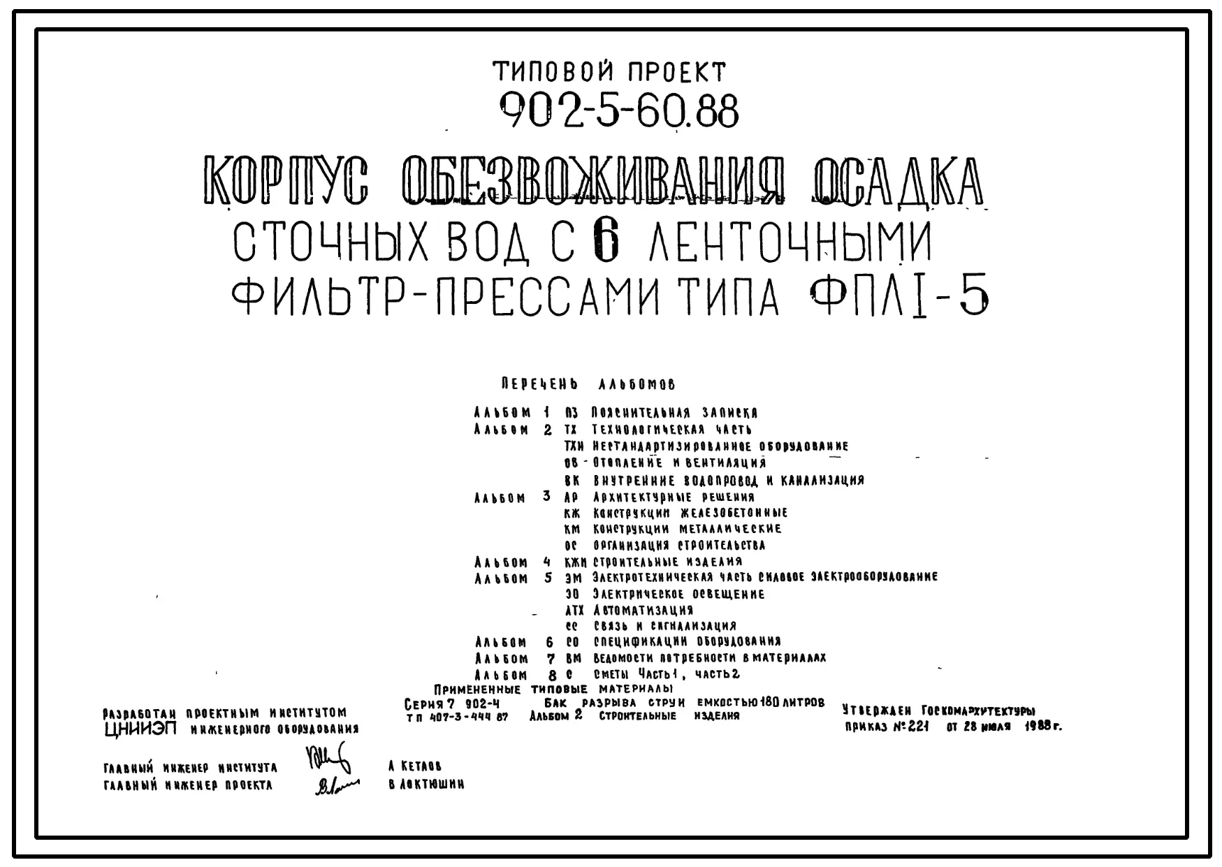 Типовой проект 902-5-60.88 Корпус обезвоживания осадка сточных вод с 6 ленточными фильтр-прессами ФПЛ1-5. Рабочие чертежи. Полный проект.