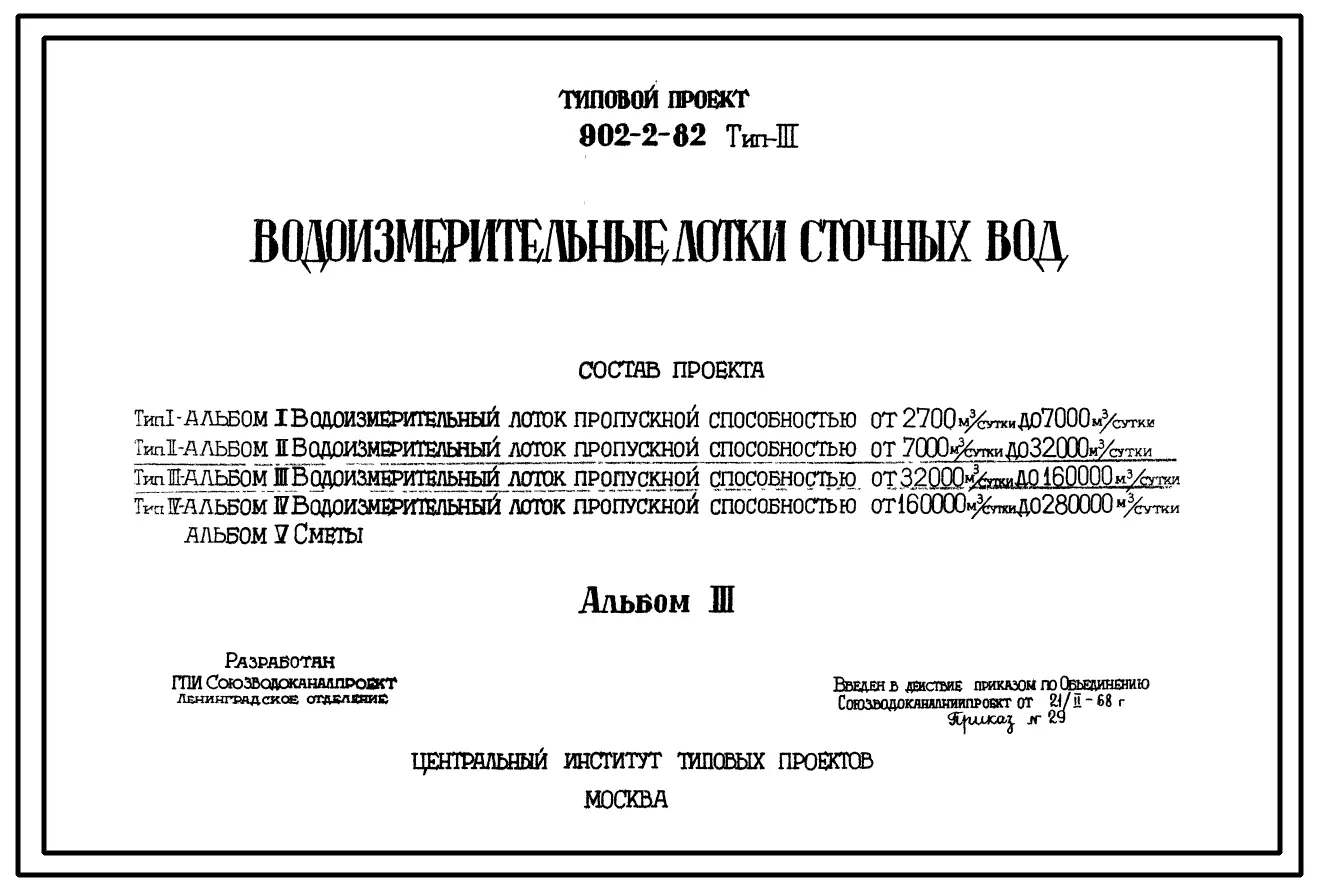 Типовой проект 902-2-82 Водоизмерительные лотки сточных вод. Тип 1- производительностью от 2700 до 7000 м.куб./сутки; тип 2- производительностью от 7000 до 32000 м.куб./сутки; тип 3- производительностью от 32000 до 160000 м.куб./сутки