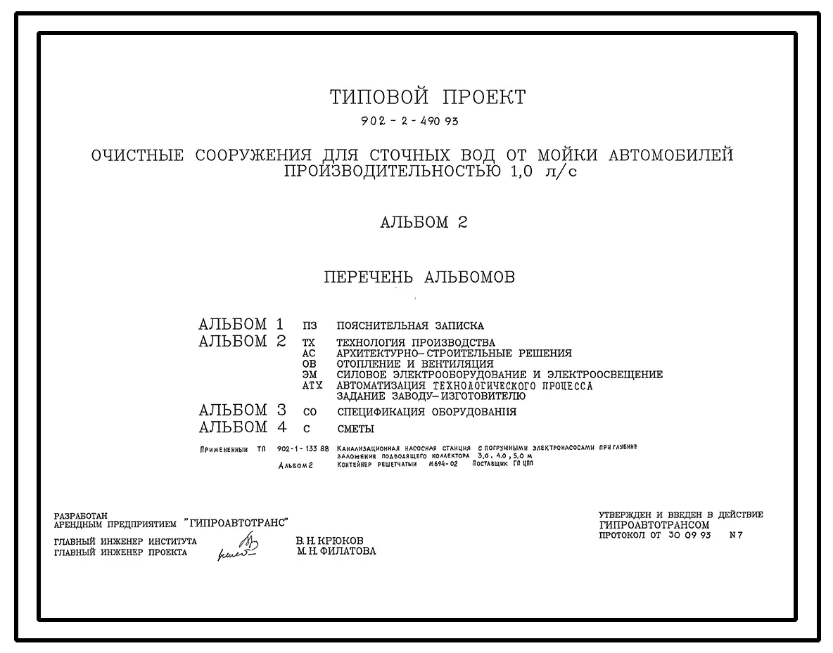 Типовой проект 902-2-490.93 Очистные сооружения для сточных вод от мойки автомобилей производительностью 1 л/с