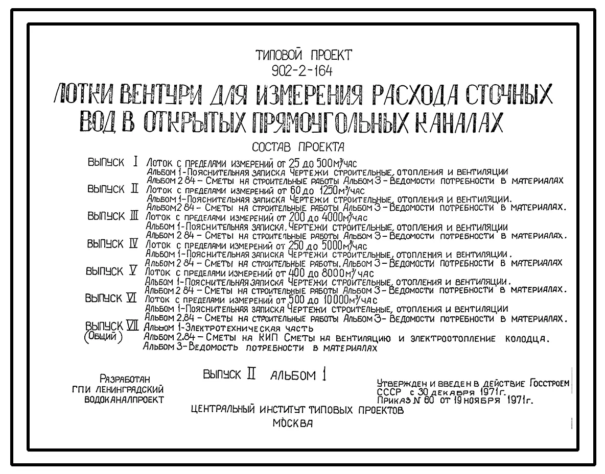 Типовой проект 902-2-164 Лотки вентури для измерения расхода сточных вод в открытых прямоугольных каналах. Полный исходный проект.
