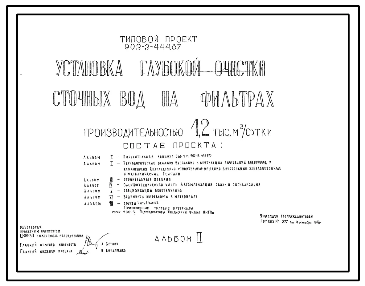 Типовой проект 902-2-444.87 Установка глубокой очистки сточных вод на фильтрах производительностью 4,2 тыс. м3/сутки