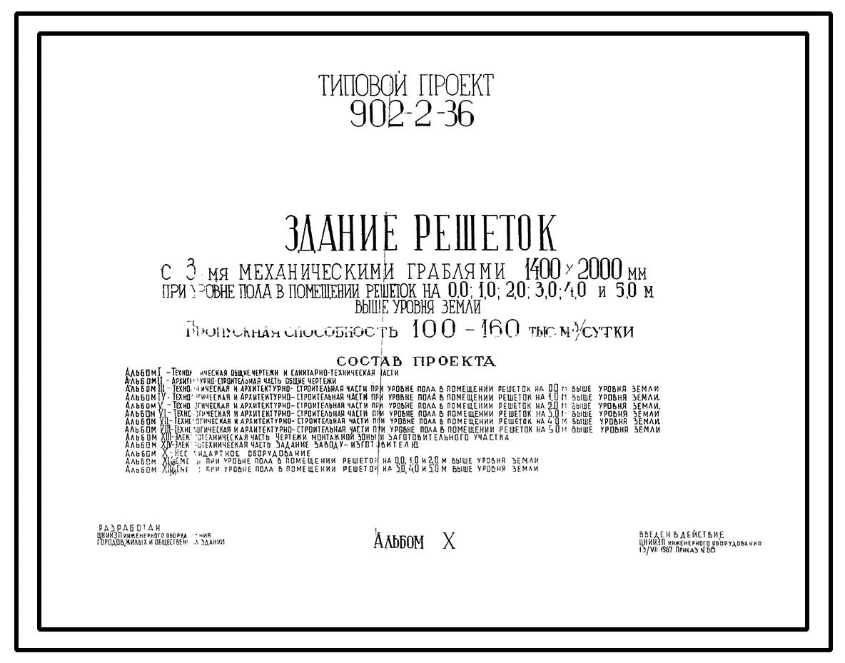 Типовой проект 902-2-36 - Здание решеток с пятью механическими граблями (1400х2000 мм). Пропускная способность 100-160 тыс. м3/сутки.