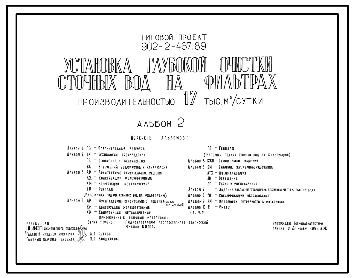 Типовой проект 902-2-467.89 Установка глубокой очистки сточных вод на фильтрах производительностью 17 000 м3/сутки.