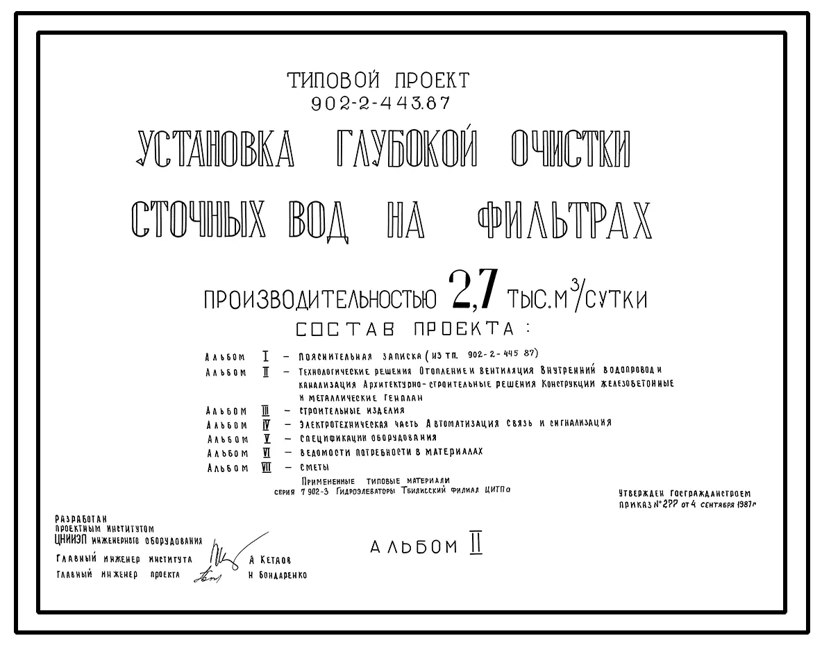 Типовой проект 902-2-443.87 Установка глубокой очистки сточных вод на фильтрах производительностью 2,7 тыс. м3/сутки