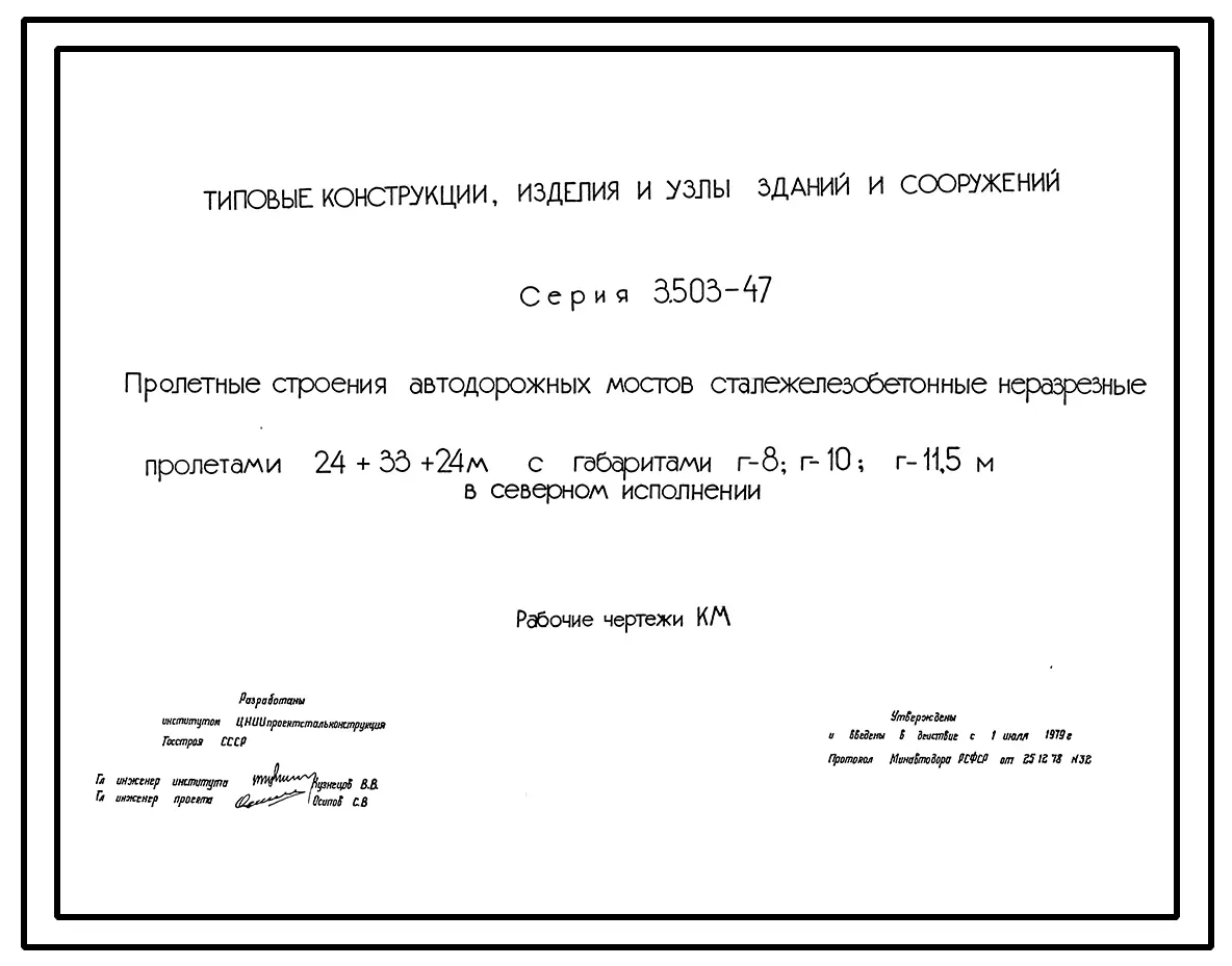 Серия 3.503-47 Пролетные строения автодорожных мостов сталежелезобетонные неразрезные пролетами 24+33+24 м с габаритами Г-8, Г-10 и Г-11,5 в северном исполнении. Рабочие чертежи.
