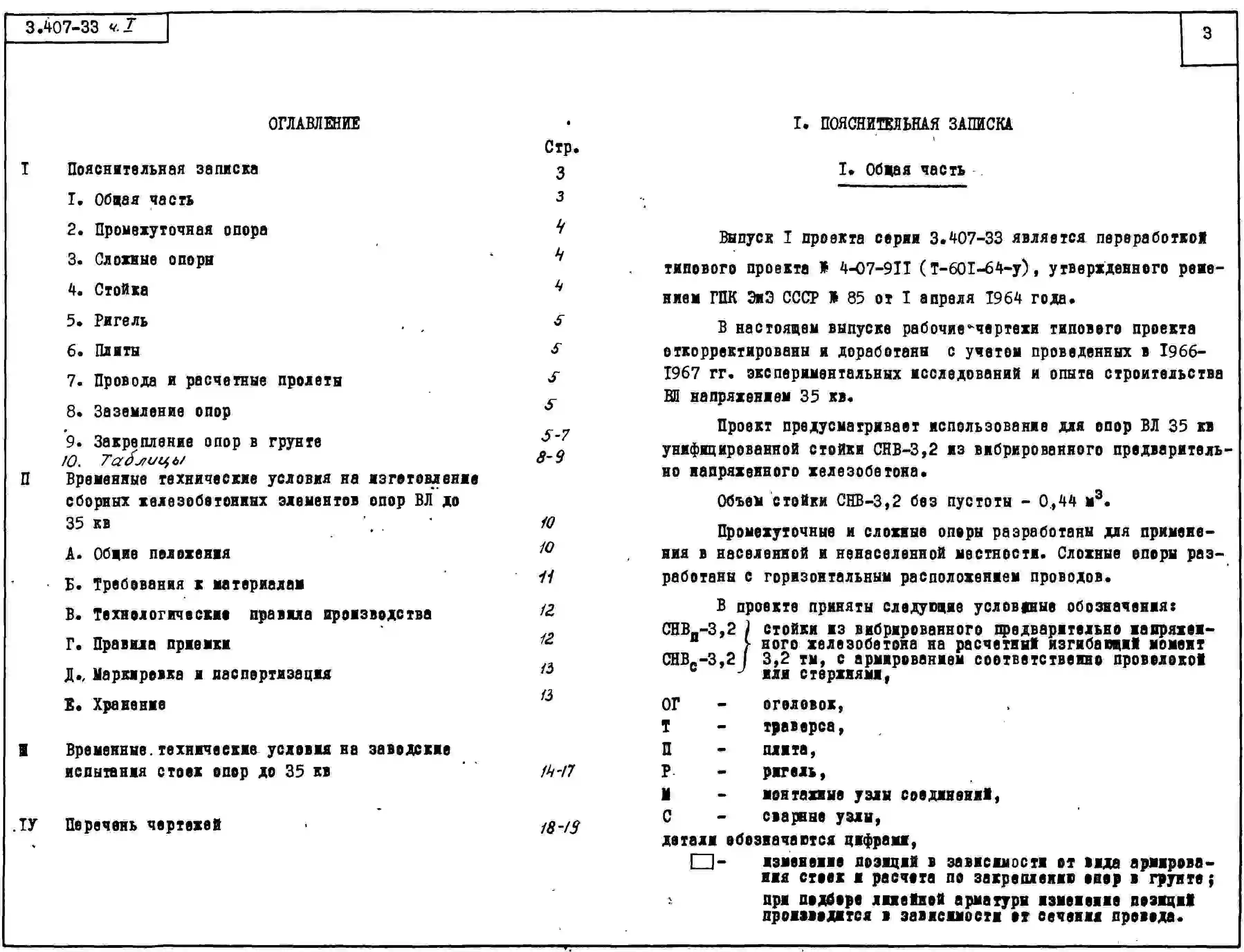 Серия 3.407-33 Унифицированные железобетонные вибрированные опоры для воздушных линий электропередачи 35 кВ со штыревыми изоляторами. Рабочие чертежи.