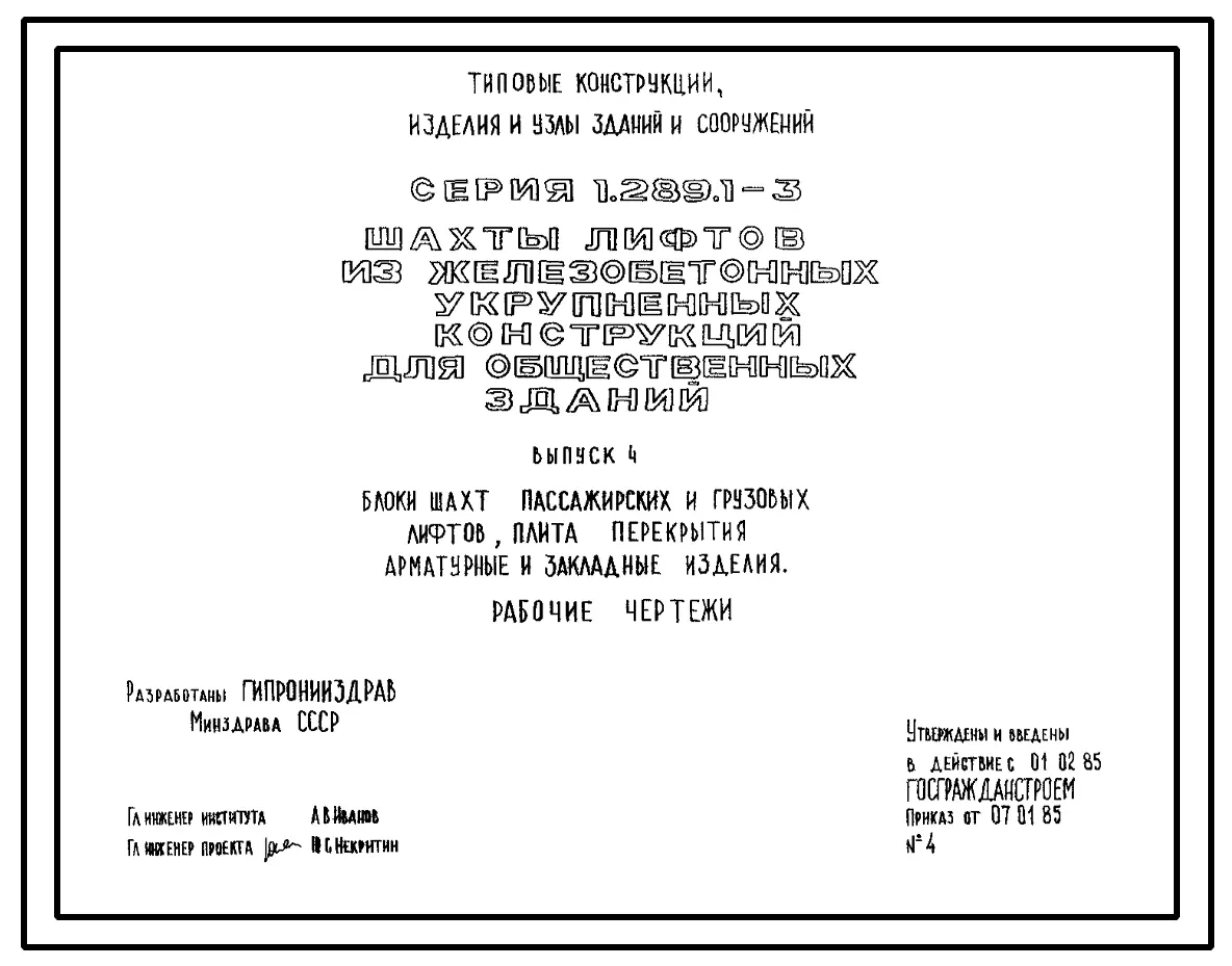 Серия 1.289.1-3 Шахты лифтов из железобетонных укрупненных конструкций для общественных зданий. Рабочие чертежи.