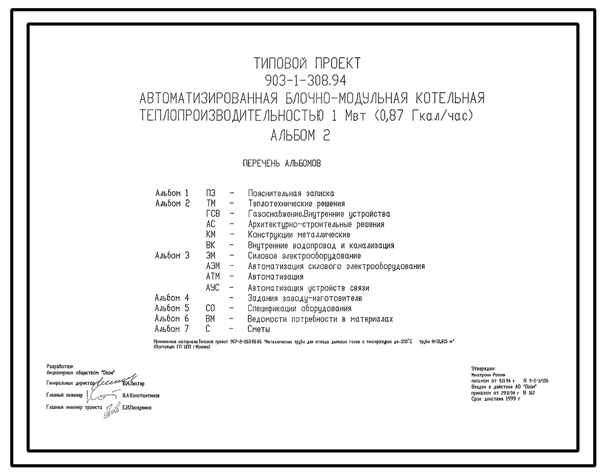 Типовой проект 903-1-308.94 Автоматизированная блочно-модульная котельная теплопроизводительностью 1,0 МВт (0,87 Гкал/ч). Топливо - природный газ
