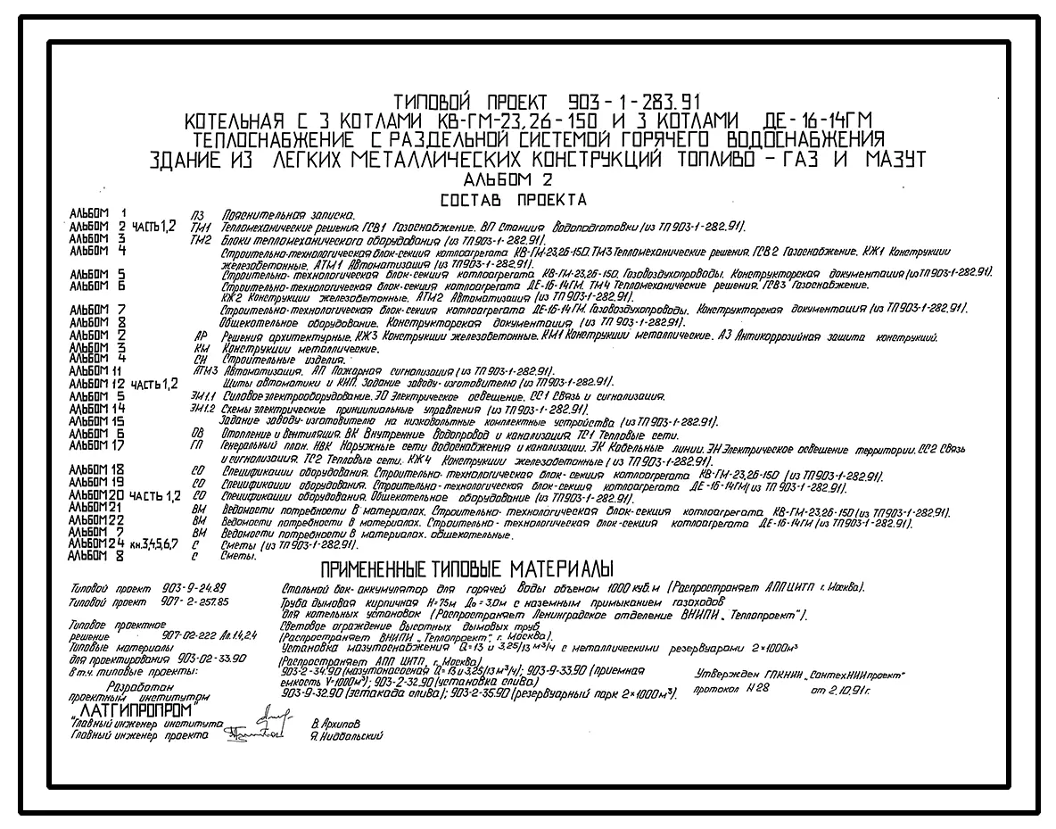 Типовой проект 903-1-283.91 Котельная с 3 котлами КВ-ГМ-23, 26-150 и 3 котлами ДЕ-16-14ГМ. Теплоснабжение с раздельной системой горячего водоснабжения. Здание из ЛМК. Топливо - газ и мазут.