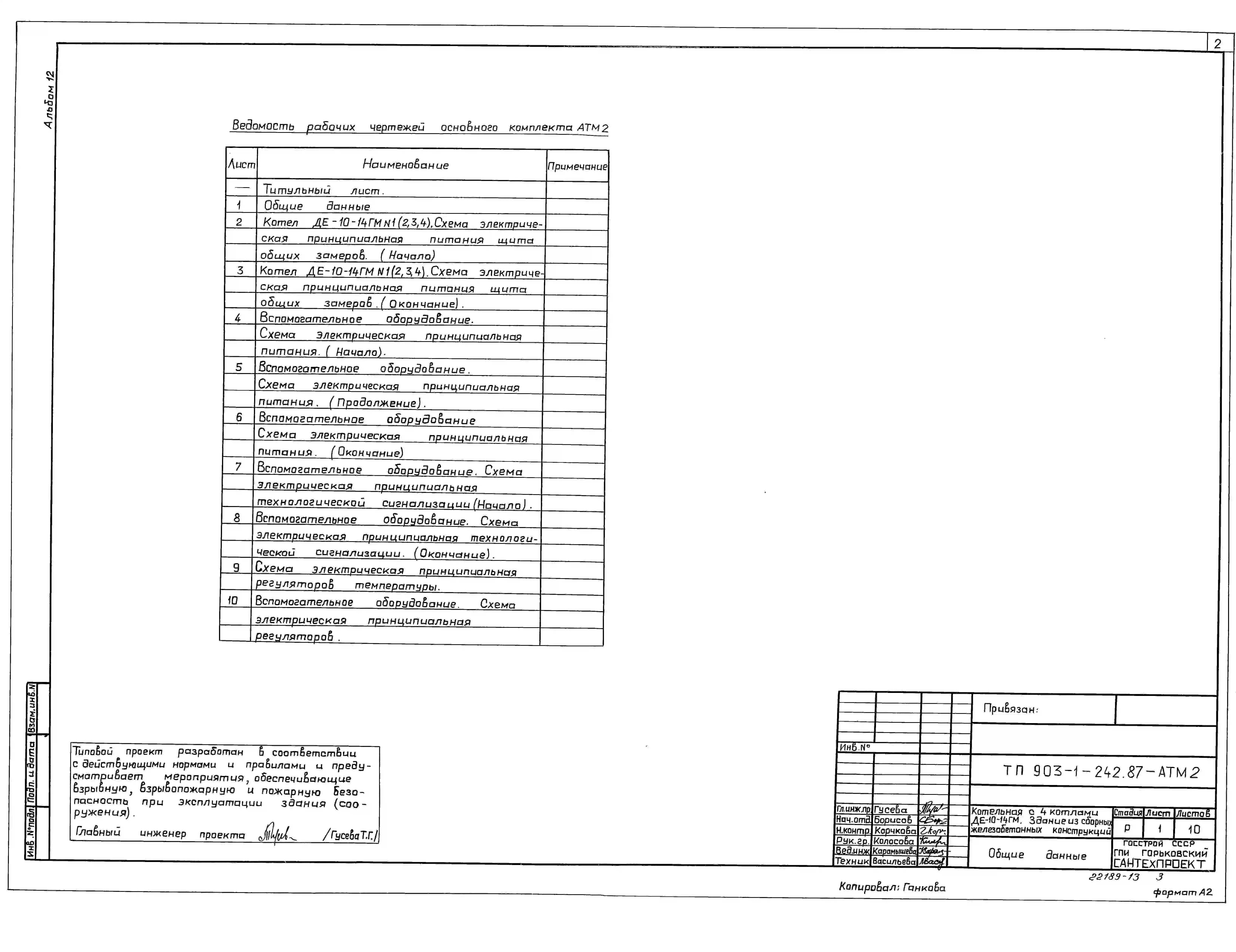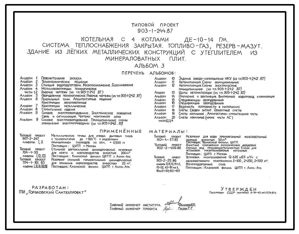 Типовой проект 903-1-244.87 Котельная с 4 котлами ДЕ-10-14ГМ. Система теплоснабжения - закрытая. Топливо - газ, резерв - мазут. Здание из ЛМК с утеплителем из минераловатных плит