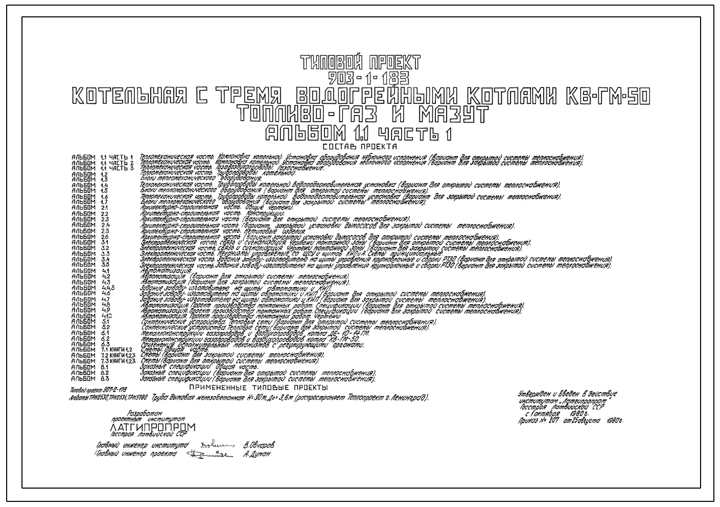 Типовой проект 903-1-183 Котельная с тремя водогрейными котлами КВ-ГМ-50. Топливо – газ и мазут