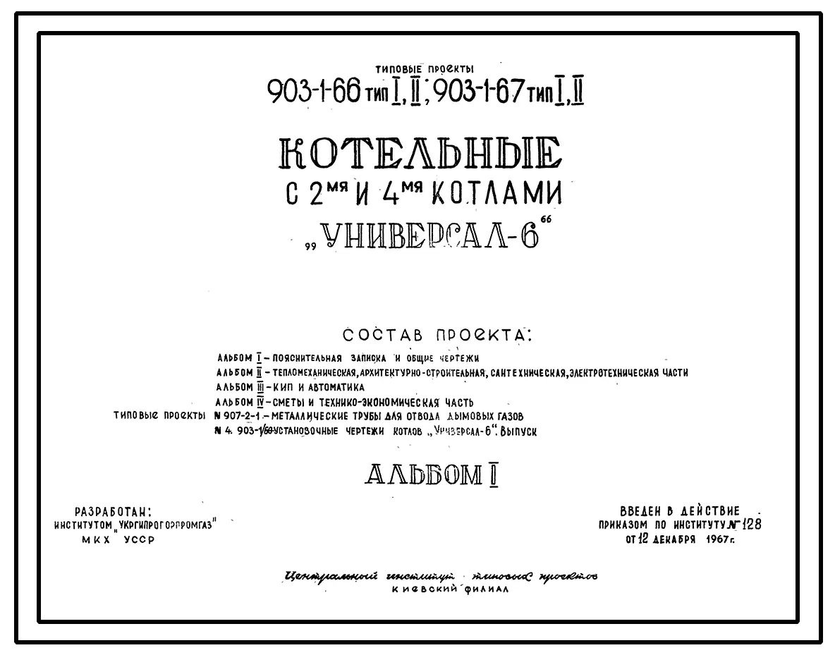 Типовой проект 903-1-66 Котельная с 2 водогрейными котлами «Универсал 6» для централизованного теплоснабжения систем отопления и вентиляции. Тип 1