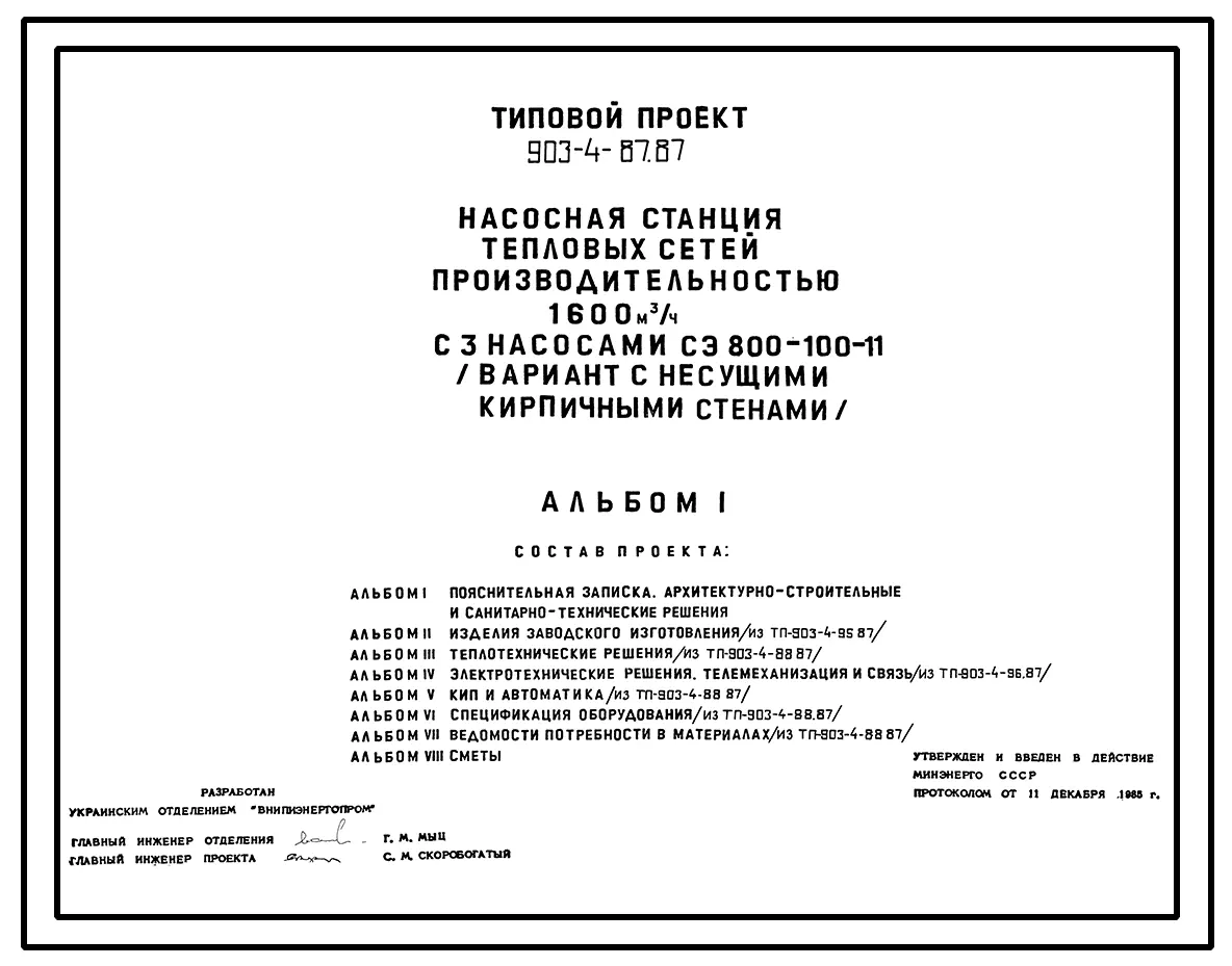 Типовой проект 903-4-87.87 Насосная станция тепловых сетей производительностью 1600 м3/ч (вариант с кирпичными стенами)