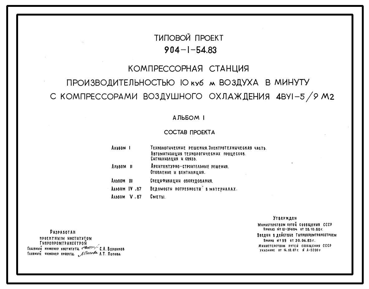 Типовой проект 904-1-54.83 Компрессорная станция производительностью 10 м3 воздуха в минуту с компрессорами воздушного охлаждения 4 ВУI-5/9 м2