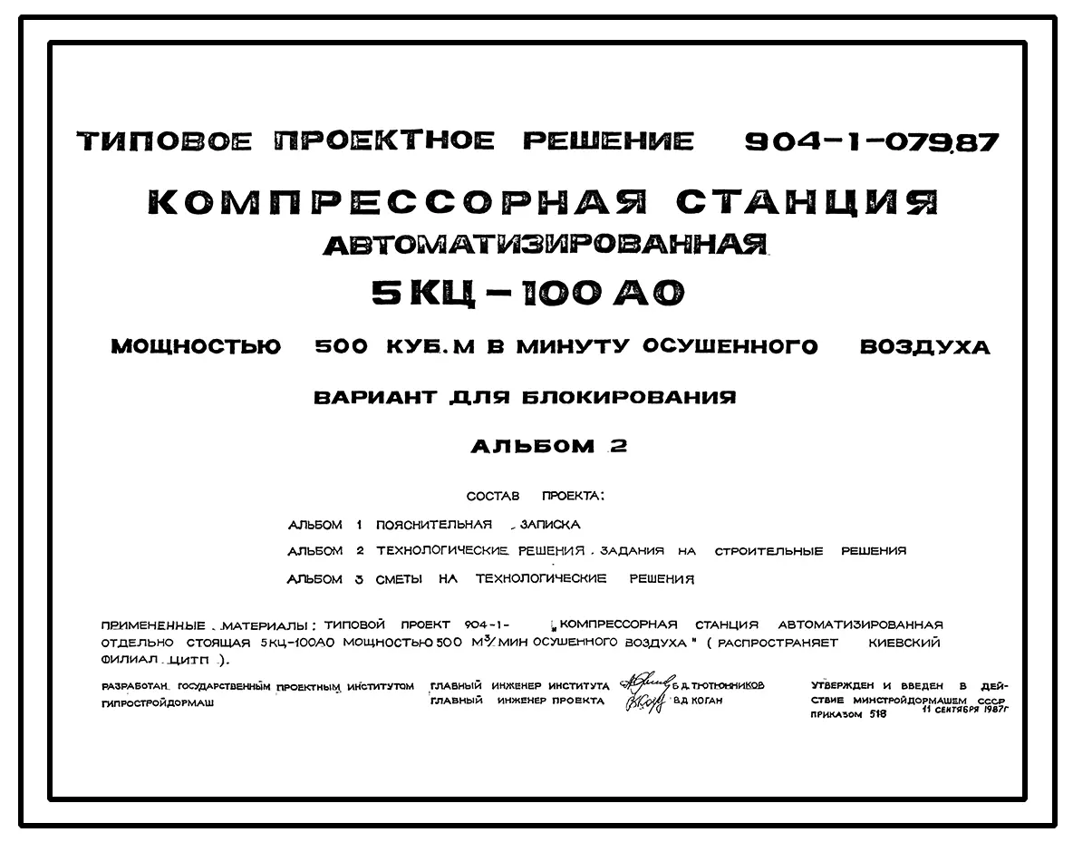 Типовой проект 904-1-079.87 Компрессорная станция автоматизированная отдельностоящая 5КЦ-100АО мощностью 500 м3/мин осушенного воздуха. Вариант для блокирования