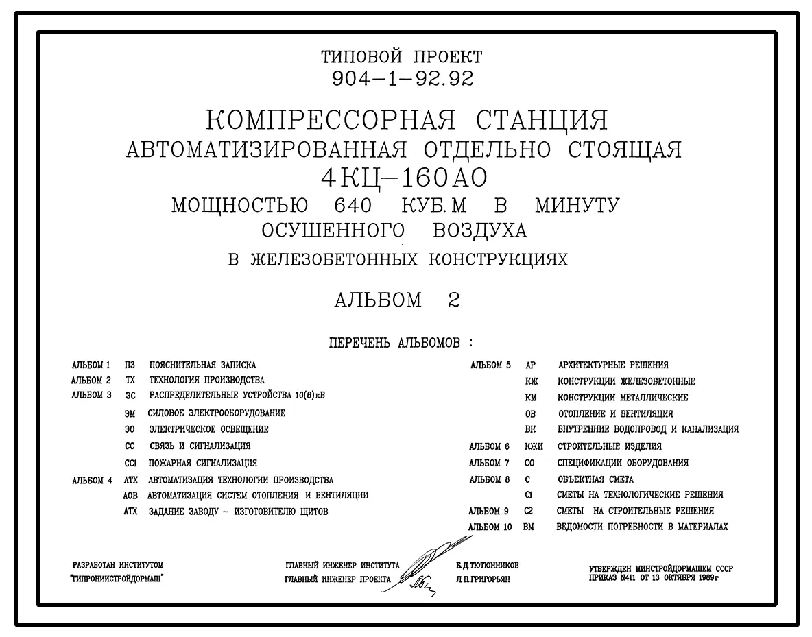 Типовой проект 904-1-92.92 Компрессорная станция автоматизированная отдельно стоящаяКЦ-160 АО мощностью 640 куб. м в минуту осушенного воздуха в железобетонных конструкциях