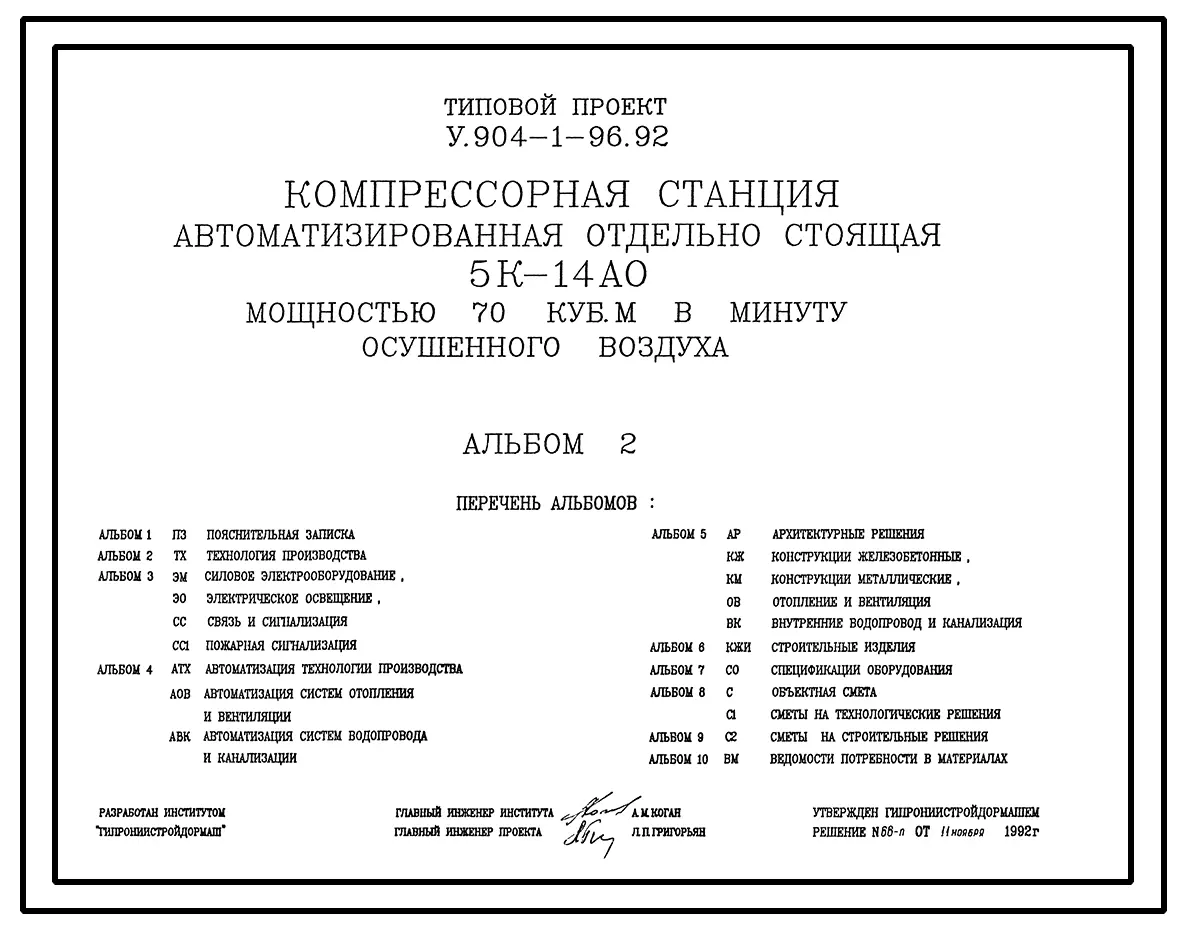Типовой проект У.904-1-96.92 Компрессорная станция автоматизированная отдельностоящая 5К-14 АО мощностью 70 куб. м в минуту осушенного воздуха