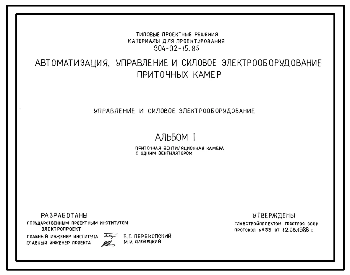 Типовой проект 904-02-15.85 Автоматизация, управление и силовое электрооборудование приточных камер. Управление и силовое электрооборудование