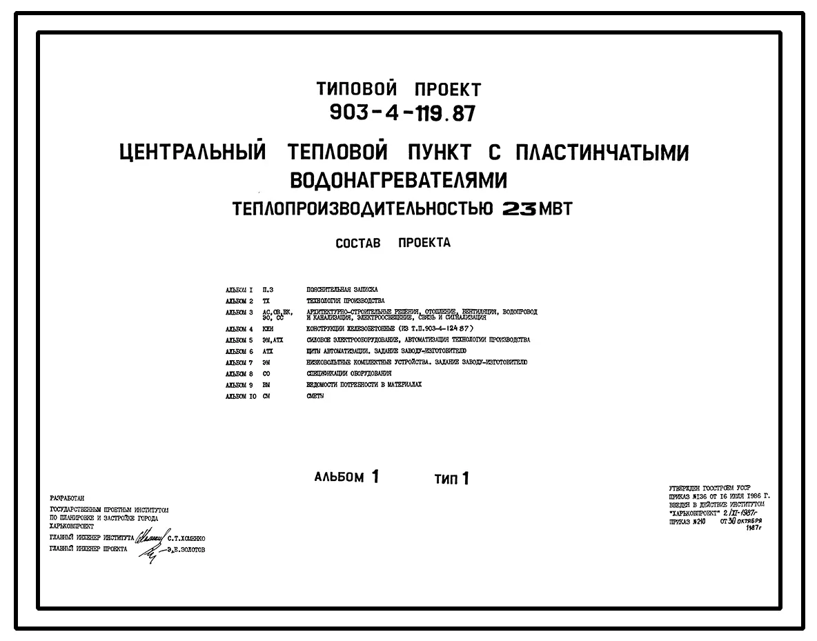 Типовой проект 903-4-119.87 Центральные тепловые пункты с пластинчатыми водонагревателями теплопроизводительностью 23 МВт. Тип 1 - зависимое присоединение систем отопления