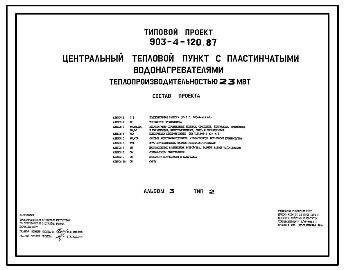 Типовой проект 903-4-120.87 Центральные тепловые пункты с пластинчатыми водонагревателями теплопроизводительностью 23 МВт: Тип 2 – зависимое присоединение систем отопления с подкачивающими насосами на подающем трубопроводе