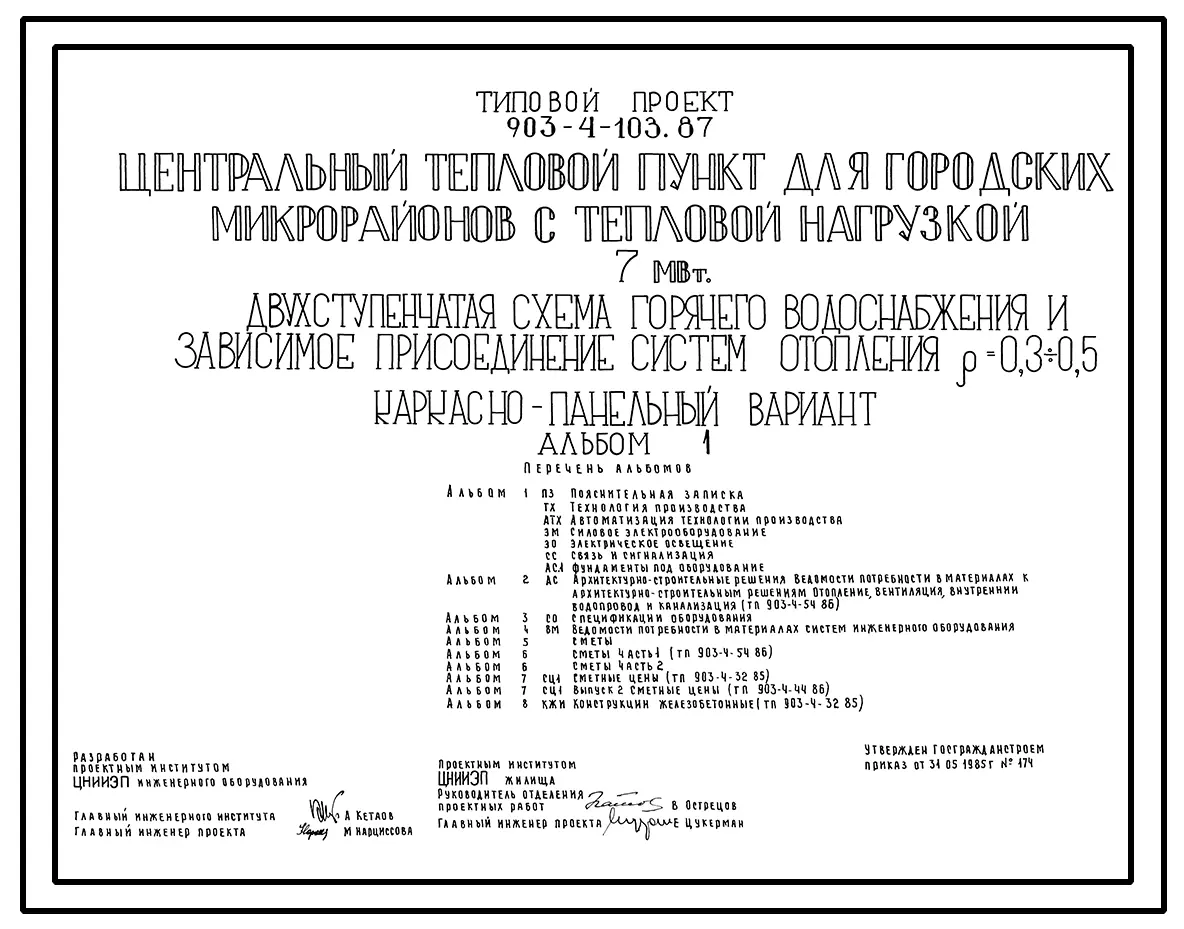 Типовой проект 903-4-103.87 Центральный тепловой пункт для городских микрорайонов с тепловой нагрузкой 7 МВт. Двухступенчатая схема горячего водоснабжения и зависимое присоединение систем отопления ?=0,3+0,5 (каркасно-панельный вариант)