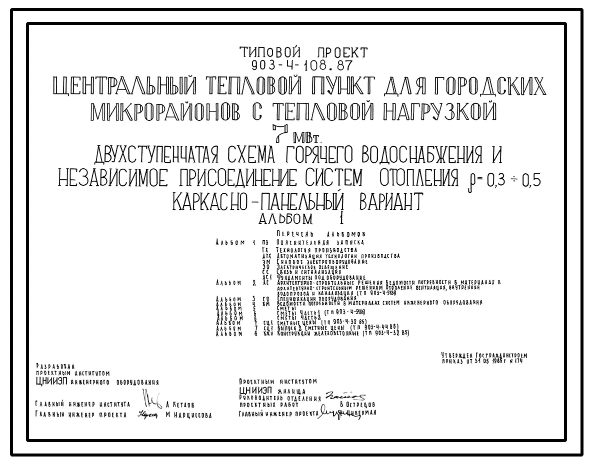Типовой проект 903-4-108.87 Центральный тепловой пункт для городских микрорайонов с тепловой нагрузкой 7 МВт. Двухступенчатая схема горячего водоснабжения и зависимое присоединение систем отопления ?=0,3+0,5 (кирпичный вариант)
