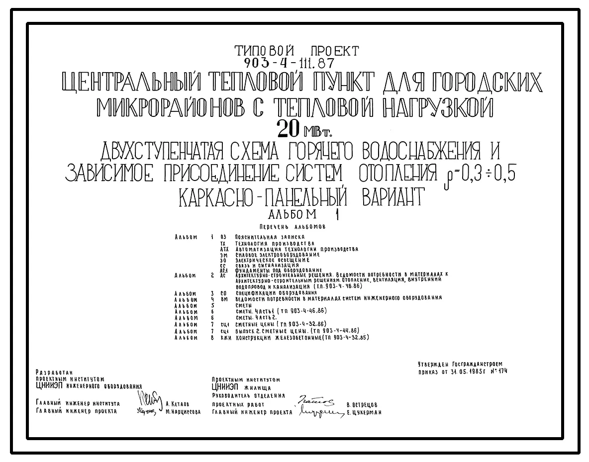 Типовой проект 903-4-112.87 Центральный тепловой пункт для городских микрорайонов с тепловой нагрузкой 20 МВт. Двухступенчатая схема горячего водоснабжения и зависимое присоединение систем отопления ?=0,3+0,5 (кирпичный вариант)