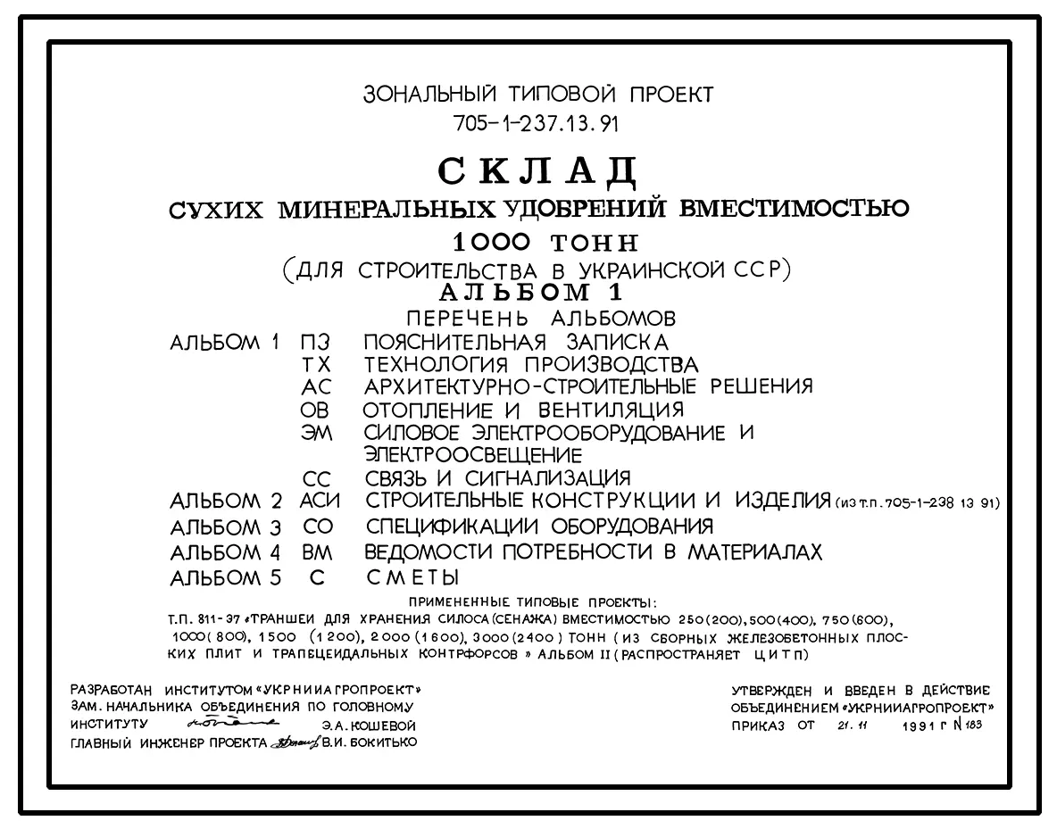 Типовой проект 705-1-237.13.91 Склад сухих минеральных удобрений вместимостью 1000 т
