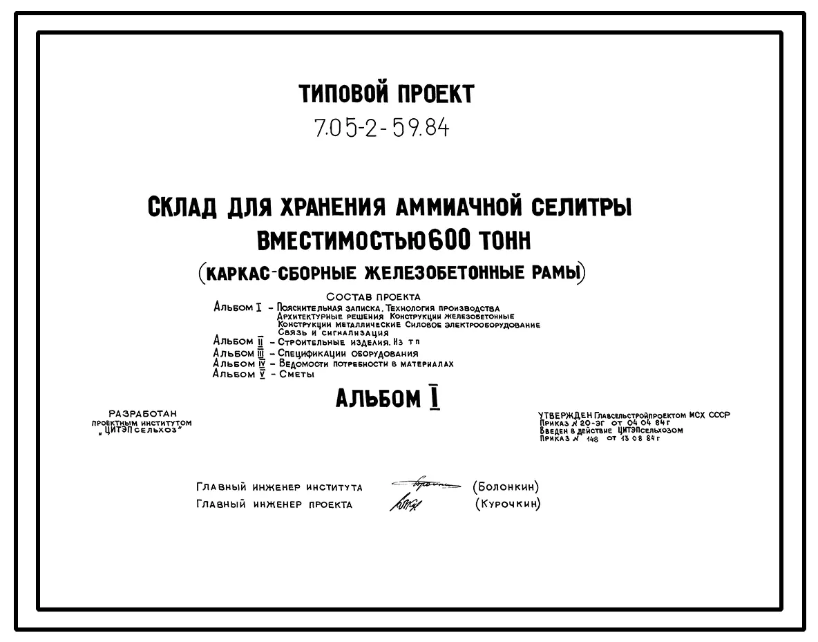 Типовой проект 705-2-59.84 Склад для хранения аммиачной селитры вместимостью 600 т. Размеры здания - 12x36 м. Расчетная температура: -30°С. Стены – панельные. Покрытие - асбестоцементные листы по железобетонным рамам и прогонам