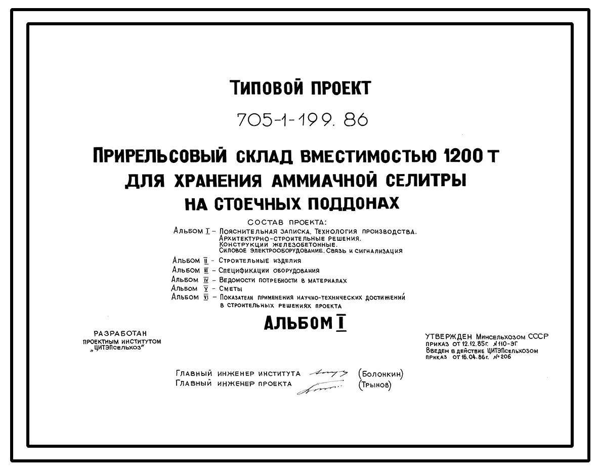 Типовой проект 705-1-199.86 Прирельсовый склад вместимостью 1200 т для хранения аммиачной селитры на стоечных поддонах. Размеры здания - 24x36 м. Расчетная температура -20, -30, -40°С. Стены - панельные железобетонные. Покрытие - железобетонные плиты по ж