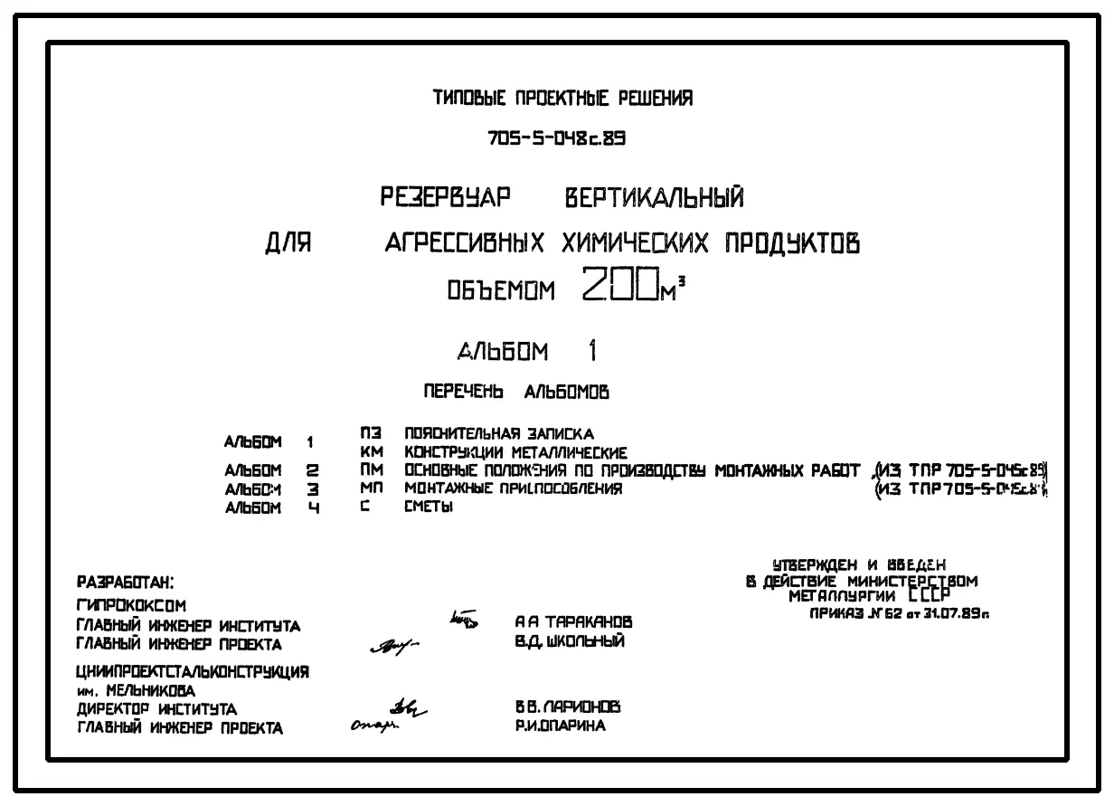 Типовой проект 705-5-048с.89 Резервуар вертикальный для агрессивных химических продуктов объемом 200м3. Сейсмичность 7 баллов.