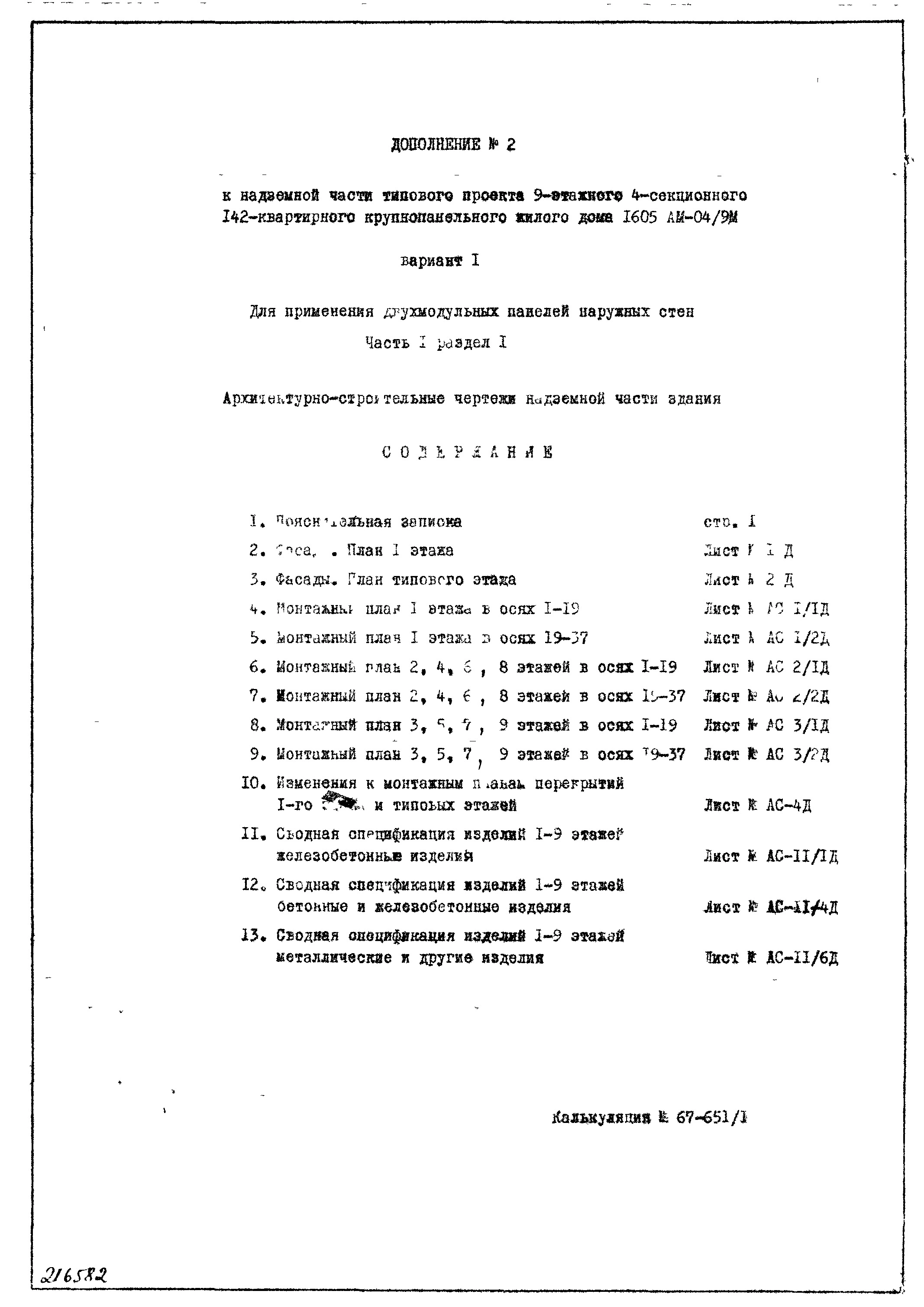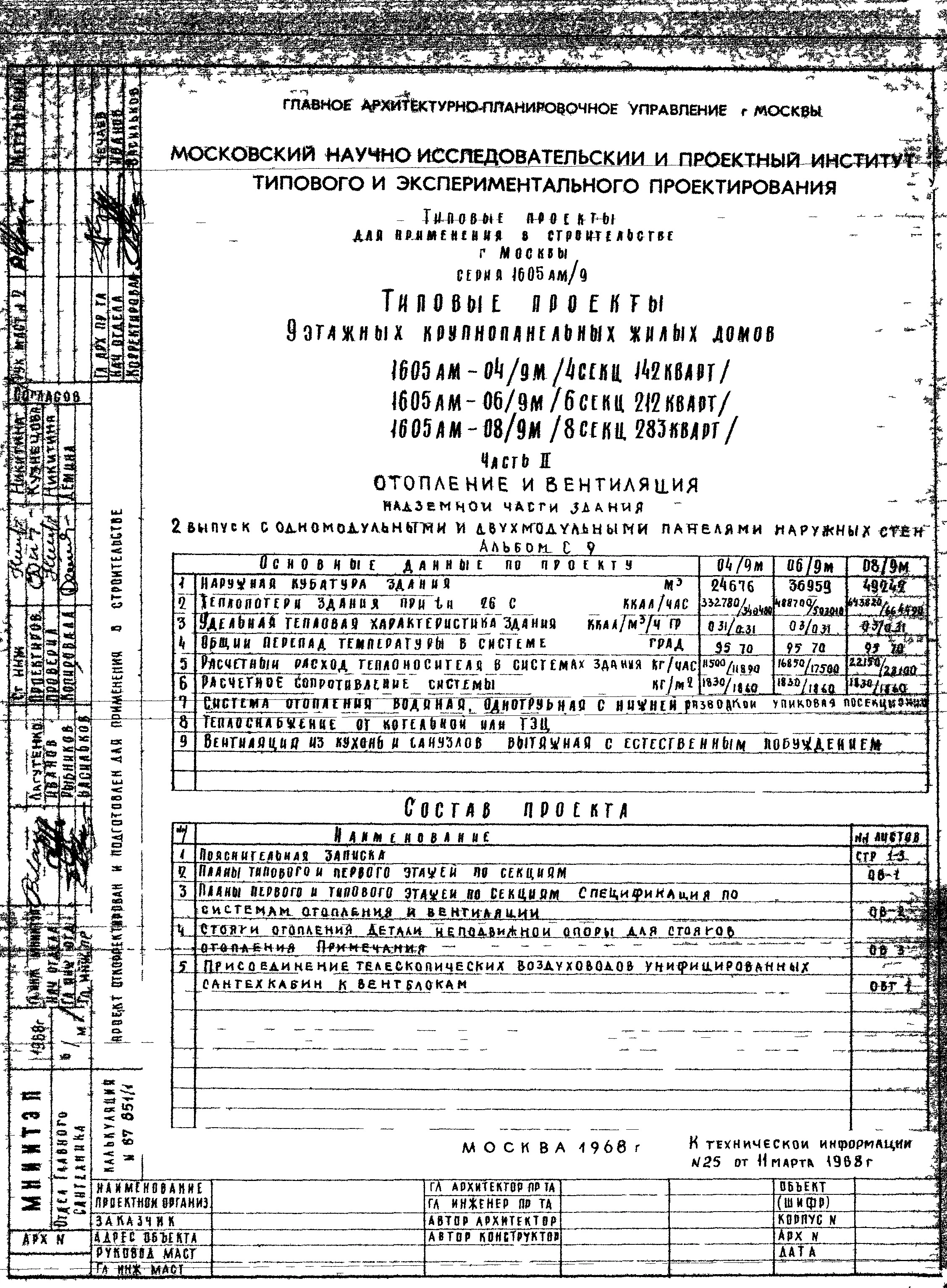 Типовой проект 1605АМ-04/9М Четырехсекционный дом на 142 квартиры (однокомнатных 36, двухкомнатных 68, трехкомнатных 38) меридиональной ориентации для строительства в г. Москве