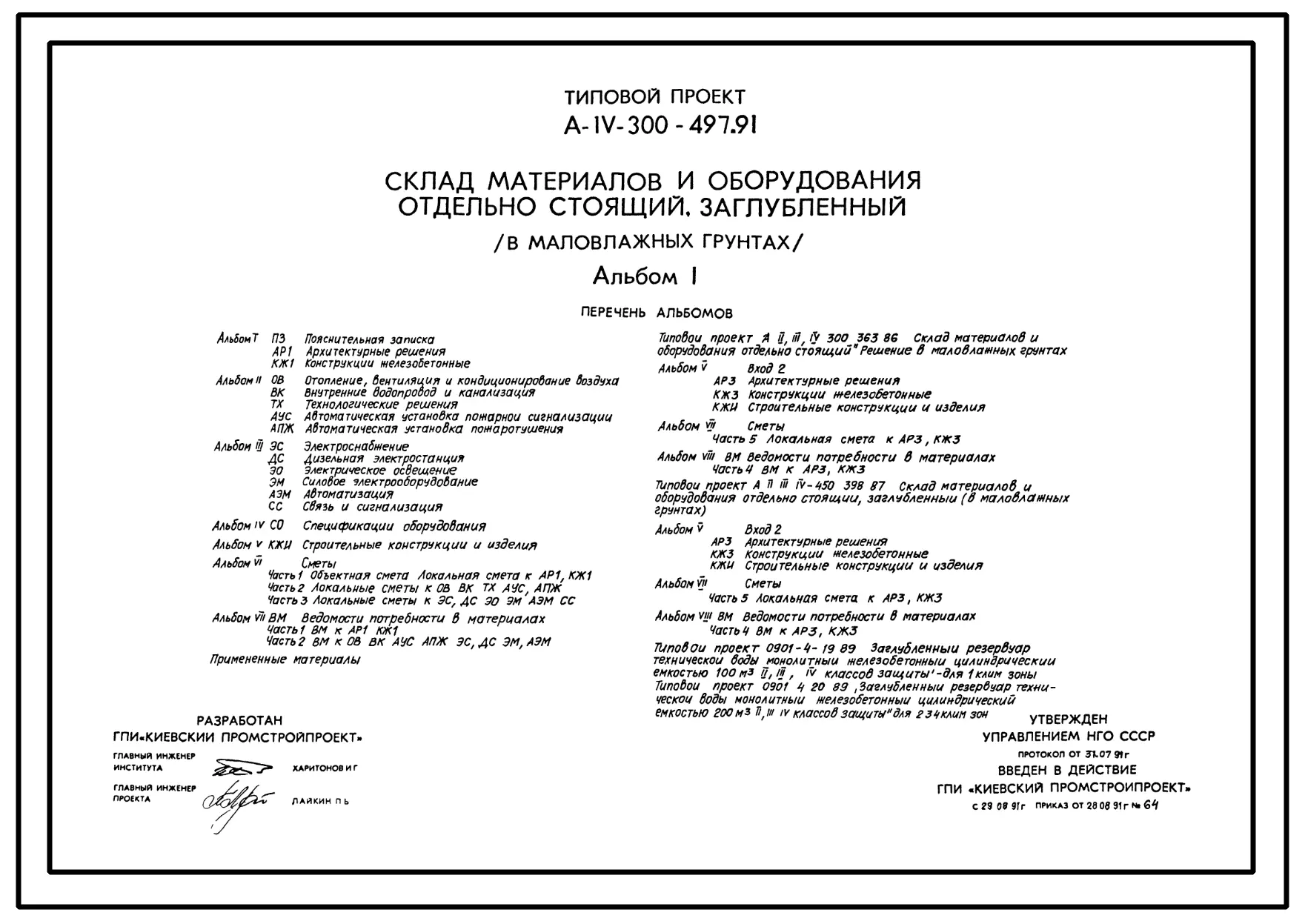 Типовой проект А-IV-300-497.91 Склад материалов и оборудования отдельно стоящий заглубленный. Стены монолитные железобетонные для маловлажных грунтов (убежище на 300 человек, размеры убежища 21м на 12м, режим вентиляции убежища 1,2,3)